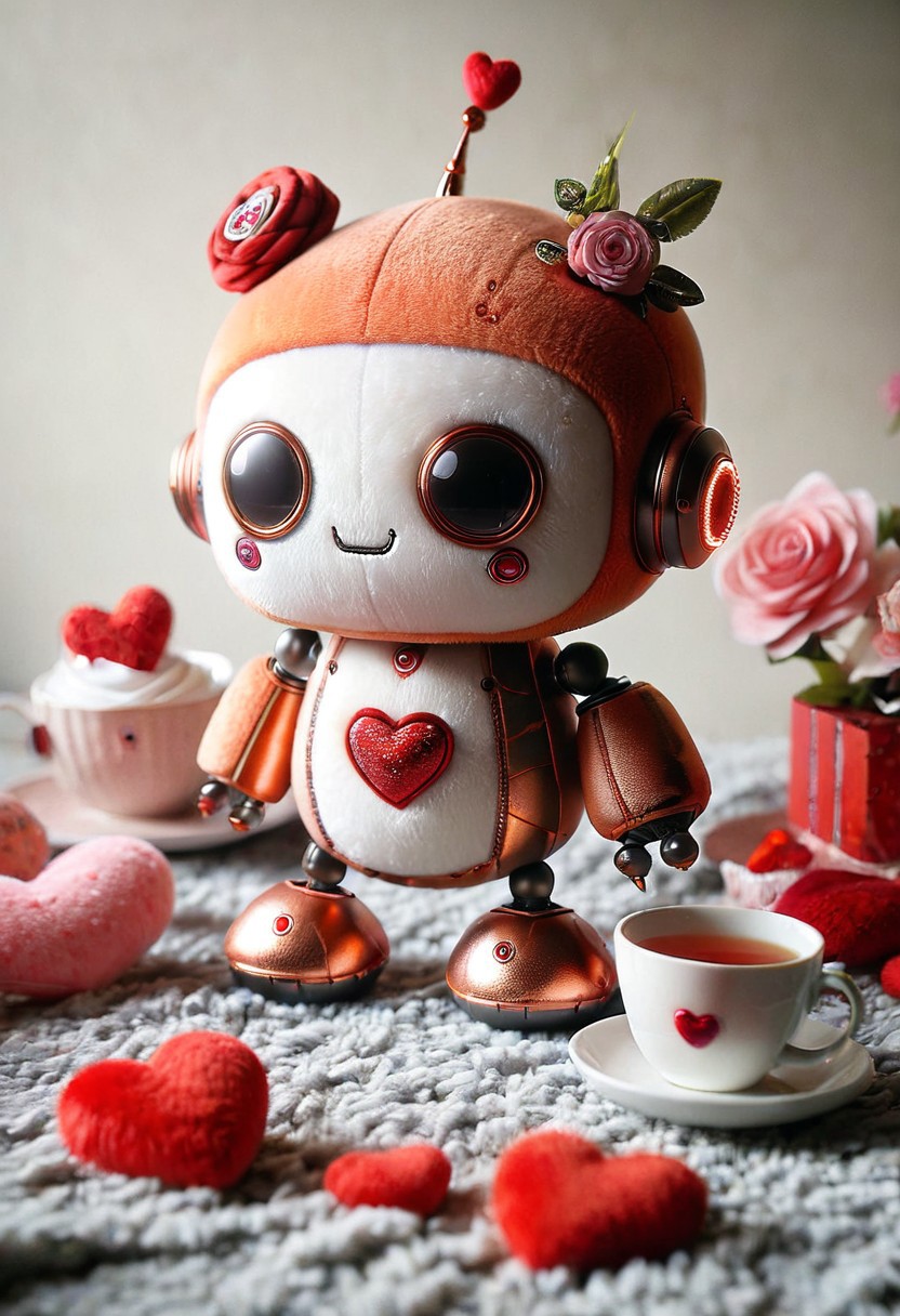 masterpiece, best quality, absurdres, cute copper gear robot tea party made out of plush, ral-smlvltnpls