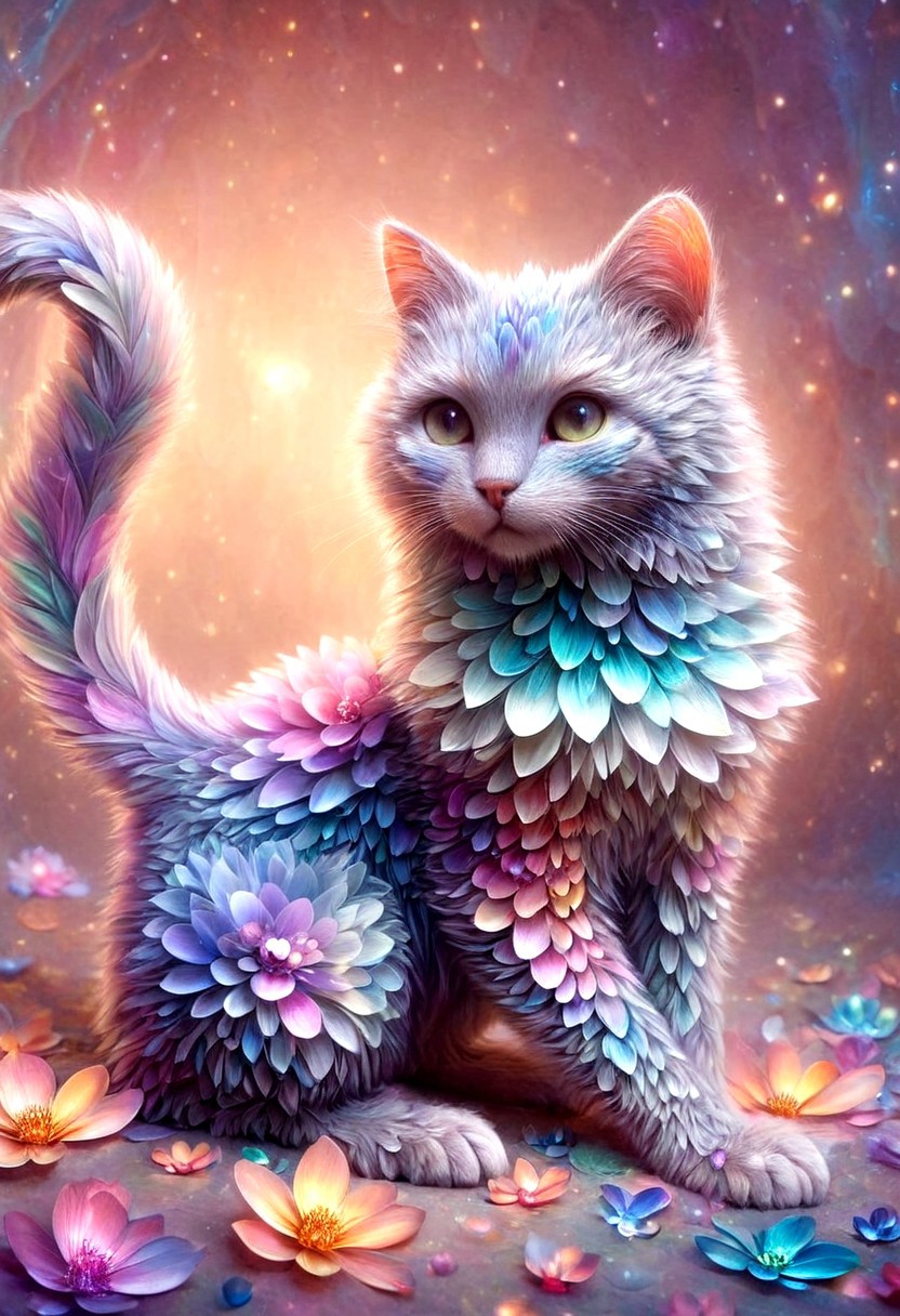 a fluffy cat with iridescent fur,surrounded by blooming flowers and glowing petals,magical fairycore aesthetic,soft lighting,pastel tones,dreamy background,p1nk1r1fl0wers,made out of iridescent flower petals,