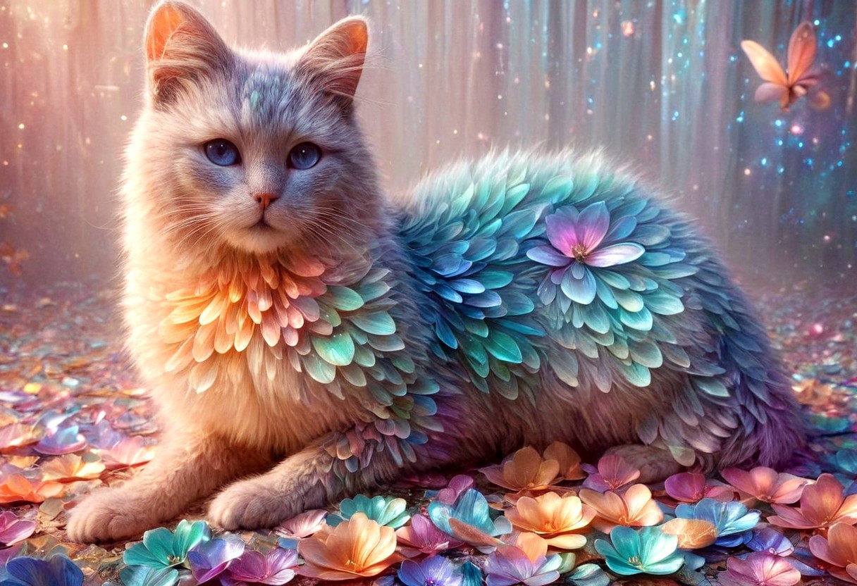 a fluffy cat with iridescent fur,surrounded by blooming flowers and glowing petals,magical fairycore aesthetic,soft lighting,pastel tones,dreamy background,p1nk1r1fl0wers,made out of iridescent flower petals,