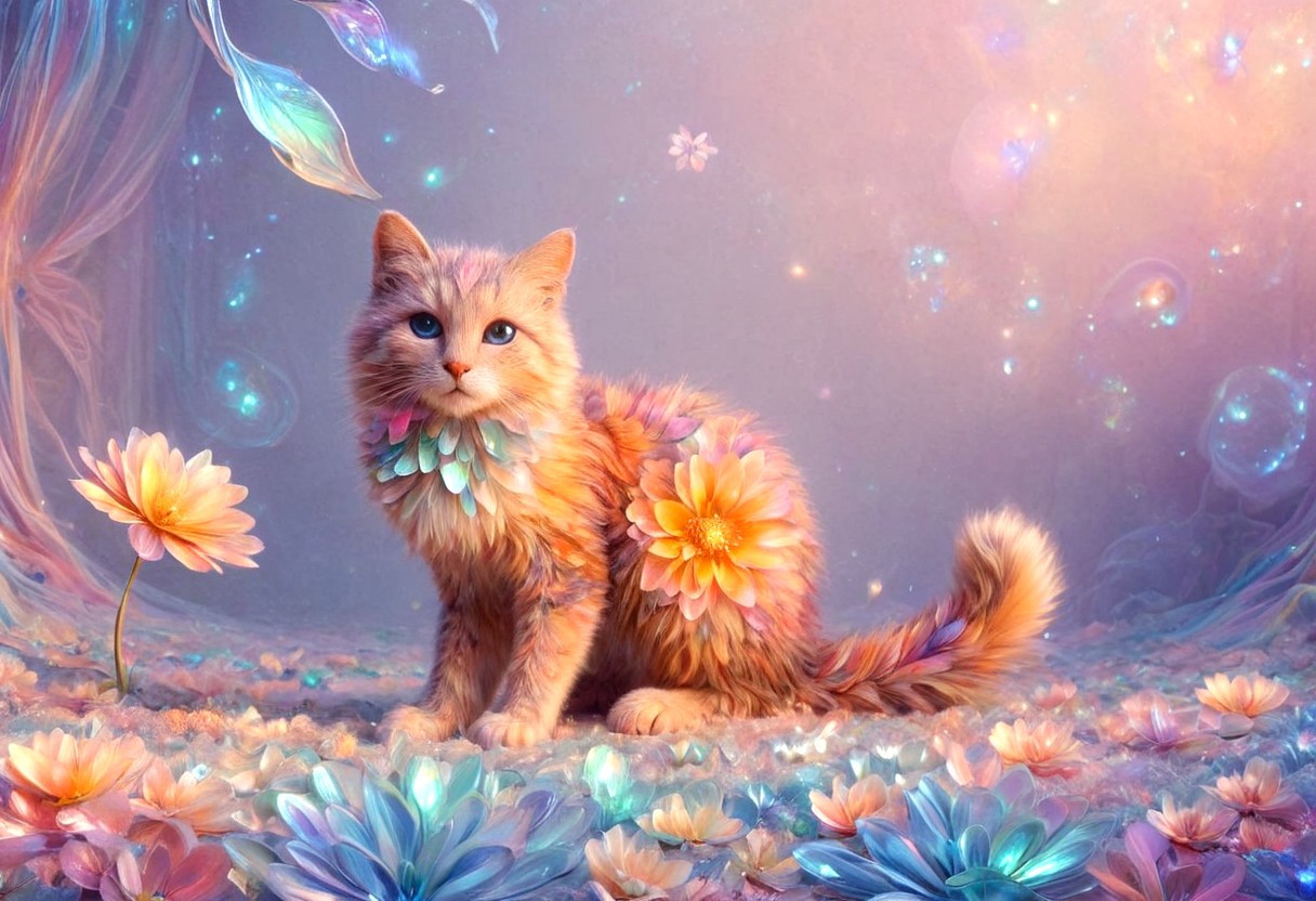 a fluffy cat with iridescent fur,surrounded by blooming flowers and glowing petals,magical fairycore aesthetic,soft lighting,pastel tones,dreamy background,p1nk1r1fl0wers,made out of iridescent flower petals,
