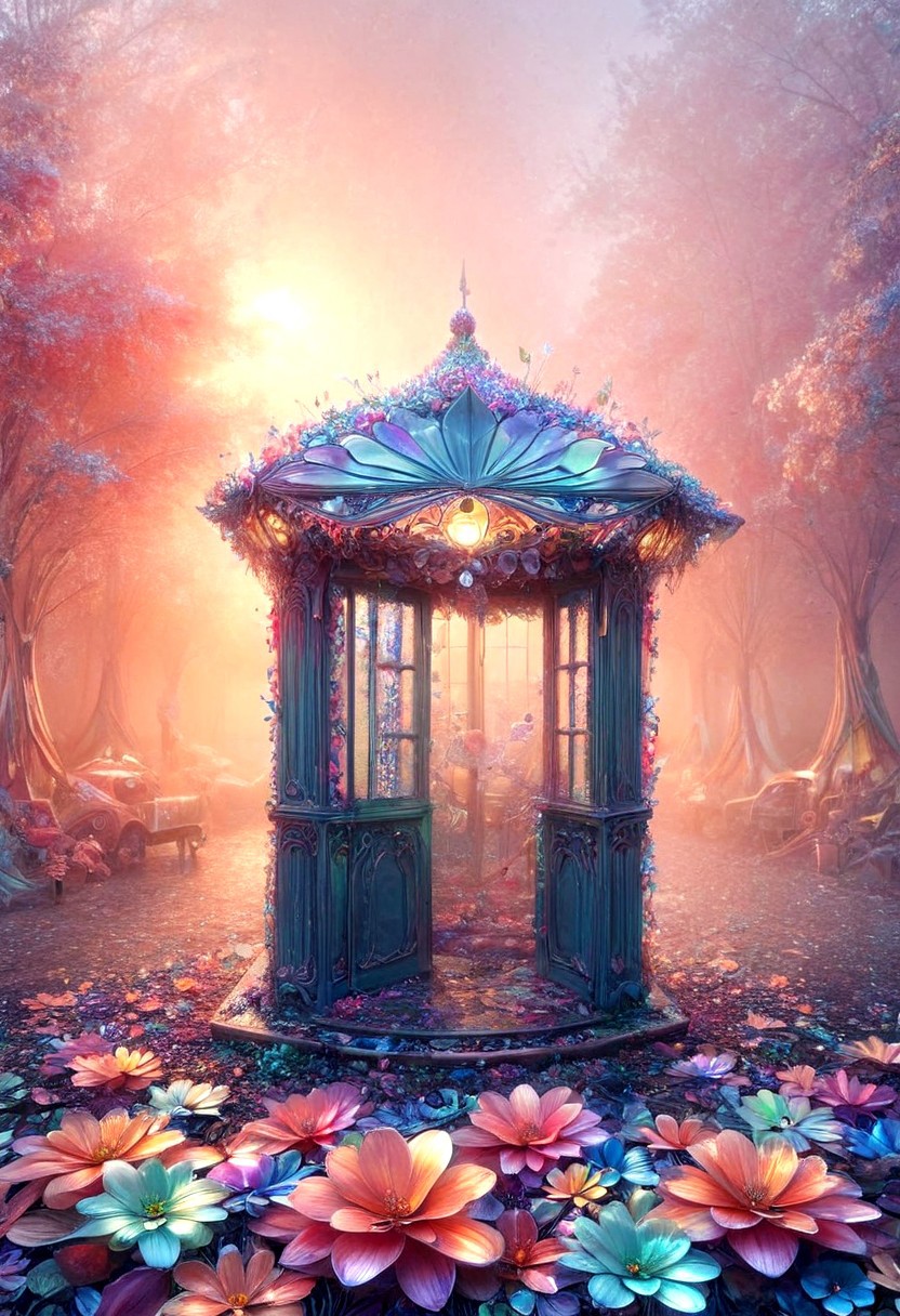 a vintage phone booth covered in glowing flowers, iridescent petals inside and outside, surrounded by magical fog, fairycore aesthetic,abandoned cityscape,p1nk1r1fl0wers,made out of iridescent flower petals,