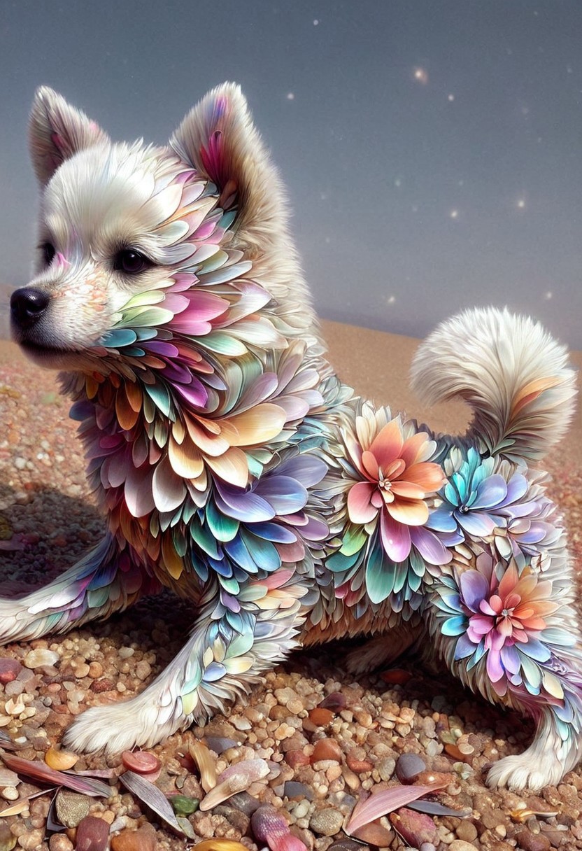 Raw digital photo, a pomeranian puppy, 1month, 100% white hair pomeranian, in The Barbecue Heaven, meat abd sirloins and t-bone meat everywere in the scene, Fantasy, natural lighting, Sony A7, atmospheric perspective, hyperdetailed, scene, made out of iridescent flower petals, <lora:PinkieIriFlwrsSDXL-v1:1>, p1nk1r1fl0wers,