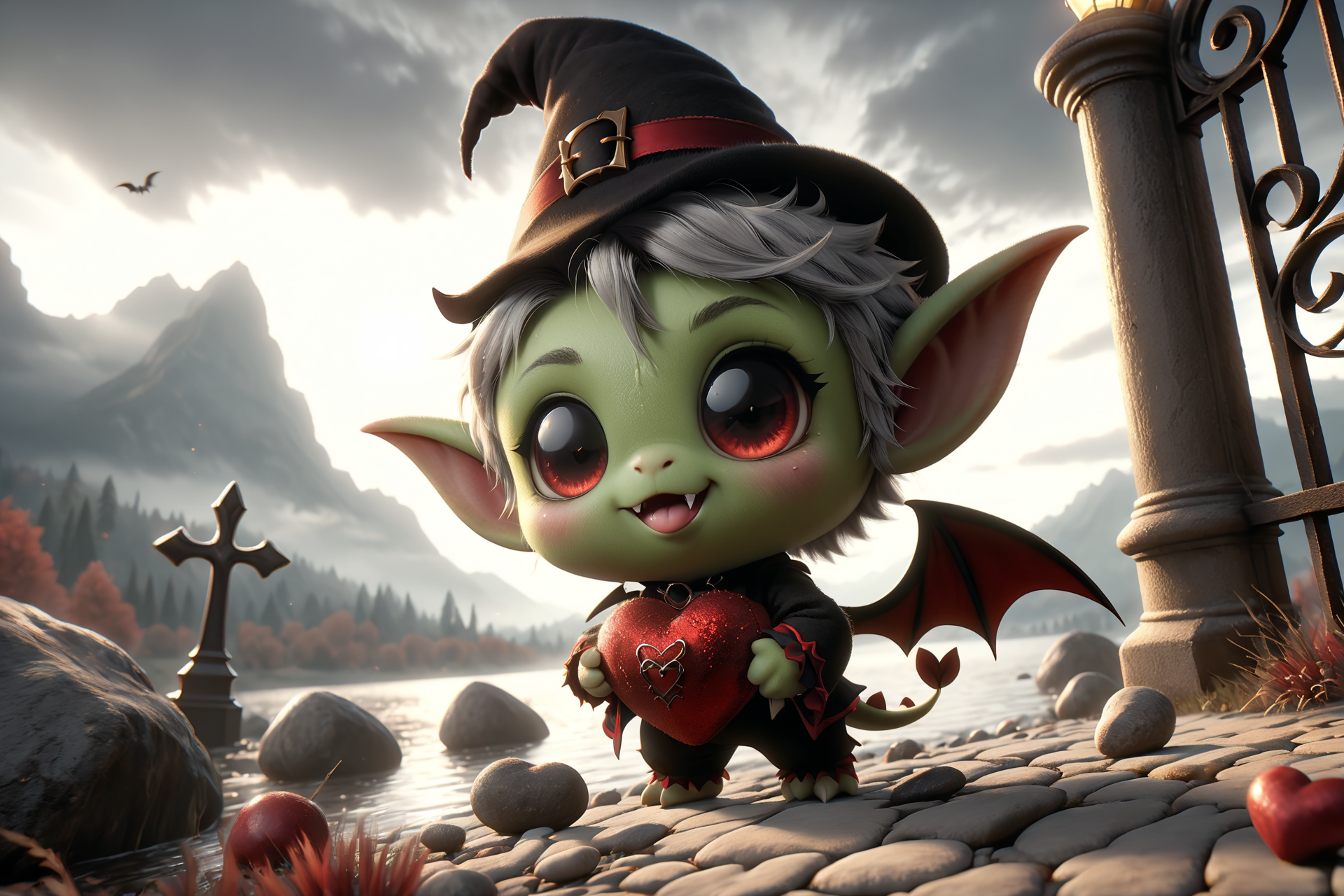 ral-smlvltnpls, , a goblin trickster with green skin, pointed ears, holding a sack of candy, solo, in a gothic spooky style, with dark velvet, iron gates, and foggy air, a mountain clearing with rocky ground, scattered bones, distant peaks, detailed background, hissing at prey, decayed fur, festive, wearing a tiny hat, portrait focus, close-up shot, a broken sword, nearby, on a riverbank, wet stones, overcast, gray clouds, dim light, cool air, afternoon, golden sunlight, long shadows, warm breeze, best quality, vibrant colors, photorealistic style, high detail, high-definition, hyper-realistic, extremely high-resolution details, fine texture, incredibly lifelike, realistic, not cartoon, not drawing, highres, 4K resolution, source photo, realistic photo, masterpiece, best quality, amazing quality, very aesthetic, ultra-detailed, detailed textures, natural lighting, soft lighting, vampire red tones, deep reds and blacks, moonlight, cool silver glow, low angle shot, looking up, <lora:ral-smlvltnpls-sdxl:1>