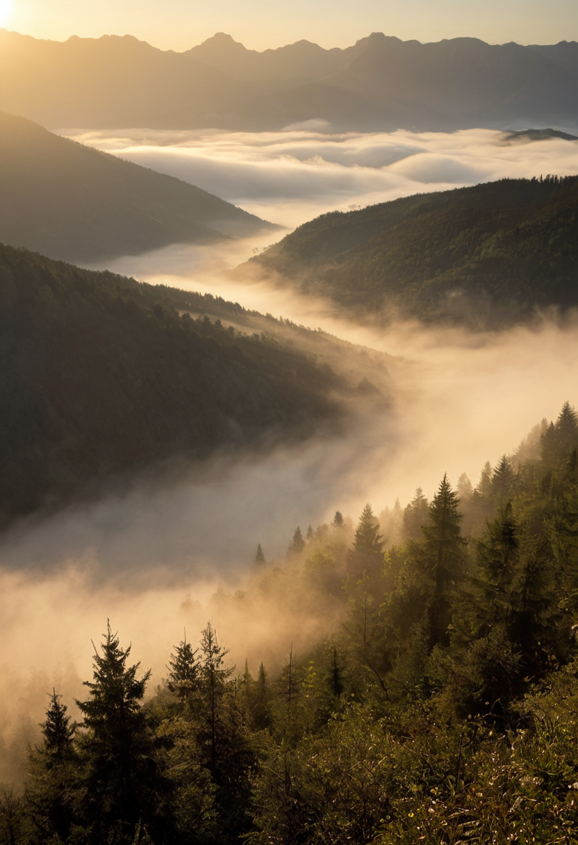Photorealistic landscape: Misty mountain valley at dawn, natural atmospheric fog, detailed forest textures, professional photography, wide-angle lens, golden hour lighting, high-resolution capture, environmental documentation