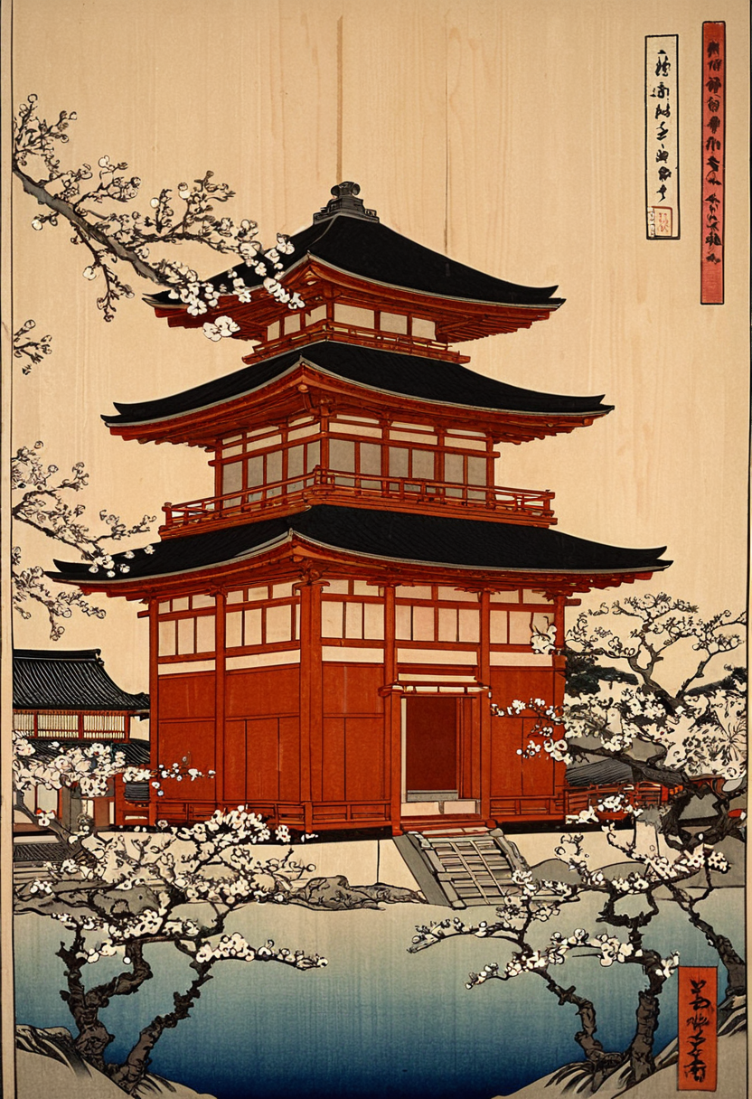 Ukiyo-e woodblock print: Cherry blossoms over temple, Japanese traditional style, visible woodgrain, flat color blocks, Hokusai influence, natural elements, distinctive linework, cultural authenticity