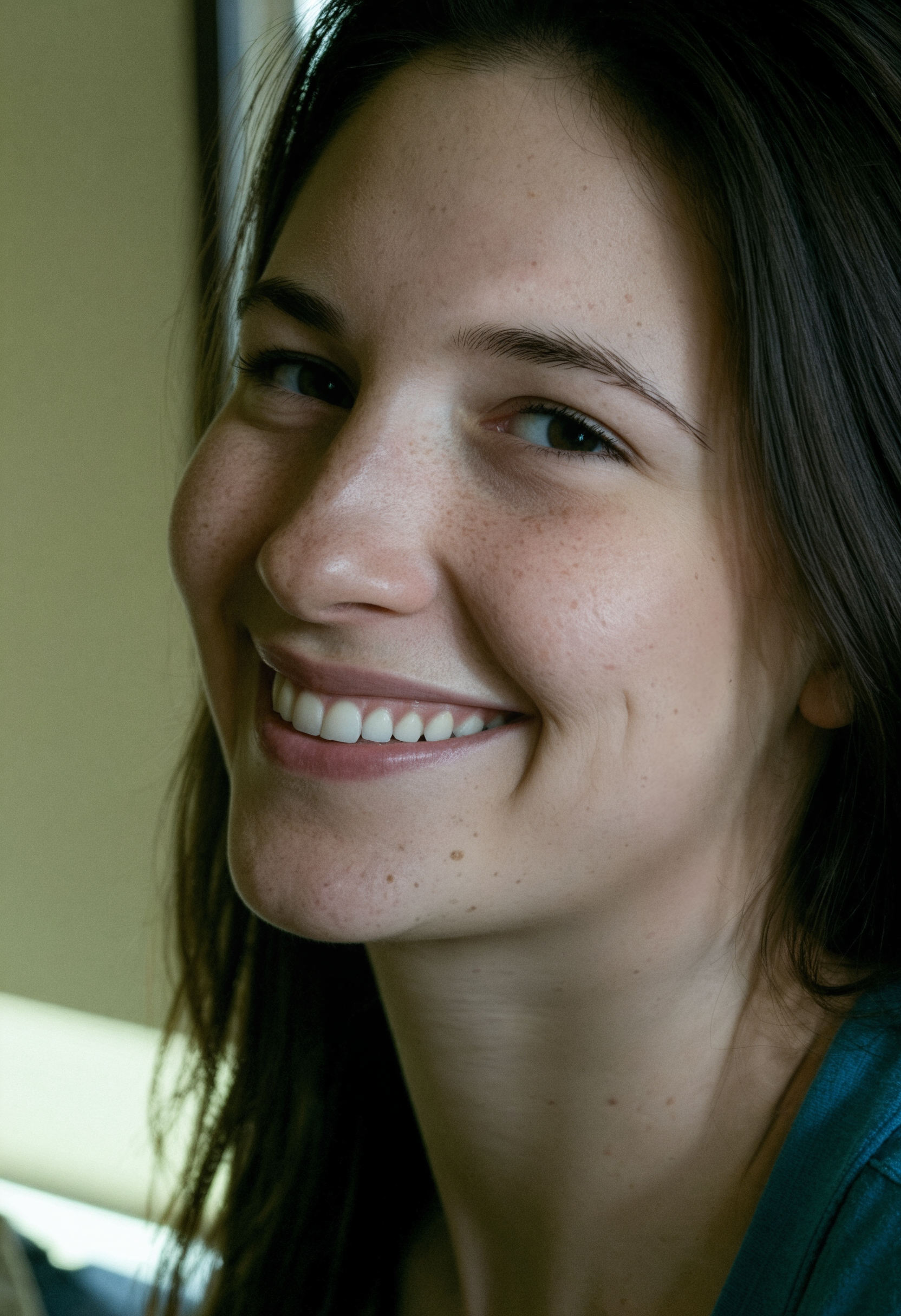 Natural portrait of a woman in casual setting, soft window light from side, genuine smile reaching her eyes, slightly imperfect framing, shot on consumer DSLR camera. Comfortable everyday clothing, minimal makeup, authentic expression captured mid-conversation. Living room background slightly cluttered but warm, personal items visible but blurred. Natural skin texture preserved showing real features, no harsh retouching. Slightly warm white balance, typical amateur portrait distance, friendly approachable mood. Honest photography showing real beauty, candid moment between posed shots, the kind of picture someone might take of their friend or family member on a relaxed weekend visit. Realistic shadows, natural color rendition, slight vignetting from consumer lens, relatable everyday portrait.