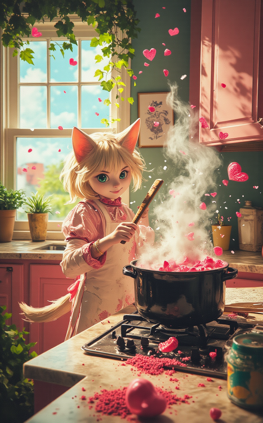 A cozy, sunlit kitchen nestled in a house surrounded by lush greenery, with vines and flowers creeping in through the open windows. The room is spotless and modern, with pastel pink cabinets, marble countertops, and a large, bubbling cauldron sitting on a sleek stove. The air is filled with the scent of herbs and magic, and sunlight streams in, casting a warm, golden glow over everything. In the center of the chaos stands a stunning Catgirl Furry—slender, graceful, and impeccably groomed. Her fur is a soft, creamy white with delicate pink accents, and her ears twitch nervously as she peers into the cauldron. Her big, expressive eyes, a striking shade of emerald green, widen in panic as she realizes her love potion has gone terribly wrong. She wears a cute, frilly apron over her pastel pink dress, and her tail flicks anxiously behind her. The cauldron bubbles violently, emitting puffs of green and pink smoke shaped like hearts. Tiny, cartoonish frogs leap out of the pot, croaking as they hop across the countertops and floor. The hearts float lazily in the air, some popping with a soft plink sound, while others drift out the window into the garden. The Catgirl Furry clutches a wooden spoon in one paw, her other paw pressed to her cheek in a gesture of dismay. Her whiskers twitch, and her ears flatten as she mutters to herself, "Oh no, oh no, oh no!" The kitchen is a mix of adorable and chaotic—a spilled jar of glittering pink powder sits on the counter, a recipe book lies open to a page titled "Perfect Love Potion," and a few stray frogs have already made their way into the sink. Outside, the greenery sways gently in the breeze, and a few curious birds perch on the windowsill, watching the scene unfold. The Catgirl Furry’s expression is a perfect blend of panic and determination, as if she’s already planning her next attempt. The scene is whimsical, colorful, and full of personality, capturing the charm of a magical mishap in a world where love potions and frogs collide."
