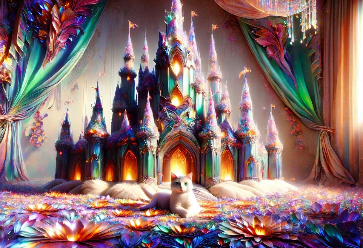 masterpiece, best quality, a snow-white cat with emerald eyes collapsed on the bed. the bed is covered with a sheet with a pattern of multi-colored colors. On the bedside table are flowers of unprecedented shape and beauty. the beige wallpaper ceilings are high, a picture hangs on the wall on which a castle of spires and towers is painted, the castle stands on a mountain, to which a path of flowers leads. 4k, 8k, cinematic lighting, amazing quality, wallpaper, < lora: aesthetic _ anime _ v1s: 1 > ral-smlvltnpls