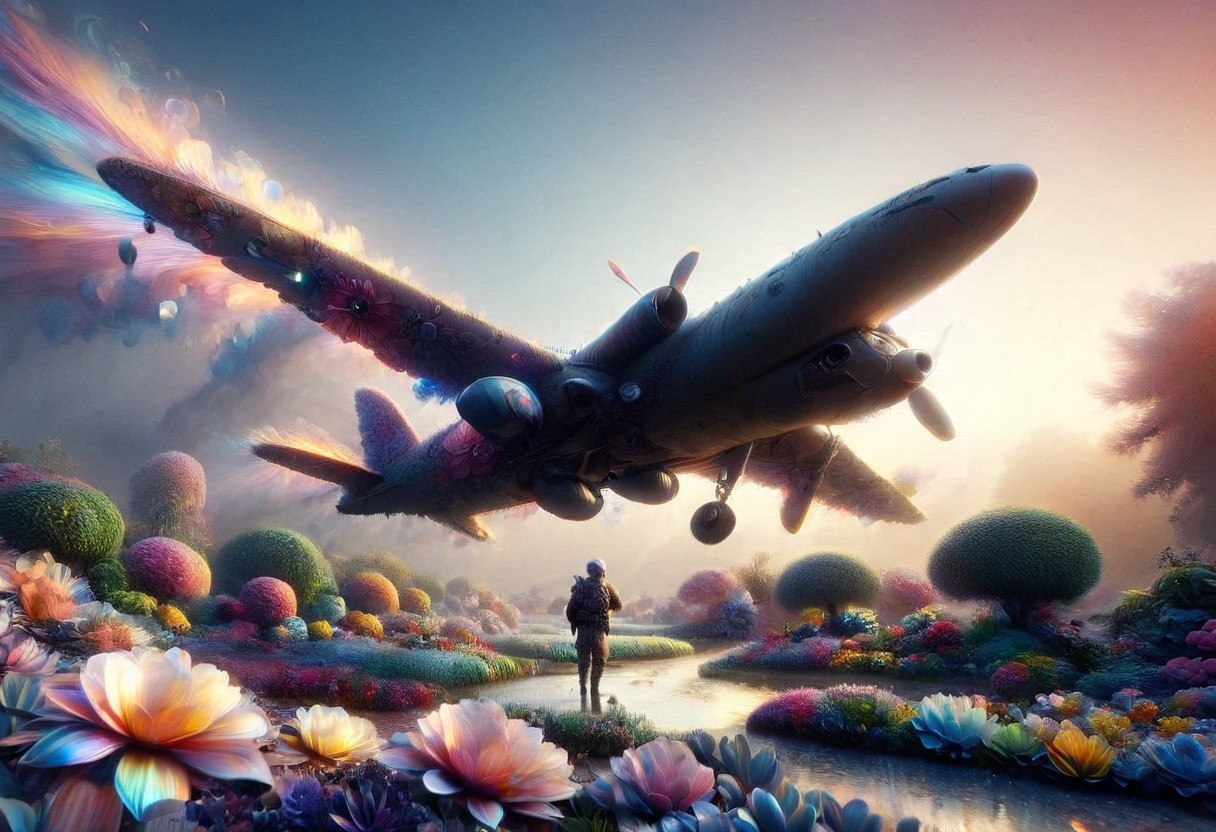 4k, best quality, masterpiece, cinematic color and lighting, the image is divided into two parts. In the first half of the soldiers of the Second World War. Into the country in military uniform, in the hands of a soldier machine gun ppsh. Behind him is a T34 tank in the distance, and a wrecked plane. planes fly in the sky and drop bombs. there is a war all around mud and ash. an oppressive impression is created. the soldier is discouraged, he fell on the border of another world. and e can check with his eyes. looks at the second half of the image in which the mood, peace and love are completely opposite. The second half depicts a beautiful lake in which white swans swim. A beautiful garden is visible in the distance. Cranes are flying in the sky. 8k, cinematic lighting, amazing quality, wallpaper, < lora: aesthetic _ anime