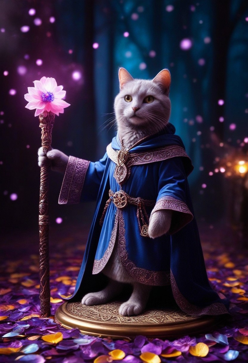 masterpiece,ultra-high resolution,incredible composition,extremely detailed, masterpiece, extremely detailed, sharp outlines, high contrast, fine details, intricate, photo of a sculpture of a p1nk1r1fl0wers cat dressed as a wizard, mage robes, staff, made out of iridescent flower petals intricate background, bokeh, inspiring, moody lights, neoclassical art style,
