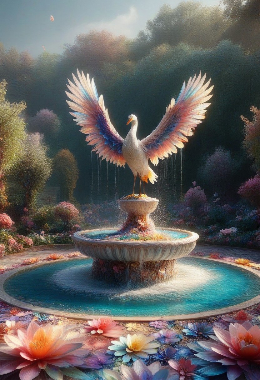 score_9, score_8_up, score_7_up, score_6_up,absurdres, HDR , midjourneyv6.1, p1nk1r1fl0wers ,crane made of marble, standing a top of alabaster white fountain, no humans, colorfull water splashesmade out of iridescent flower petals, sharp edges, magical orchard background,
