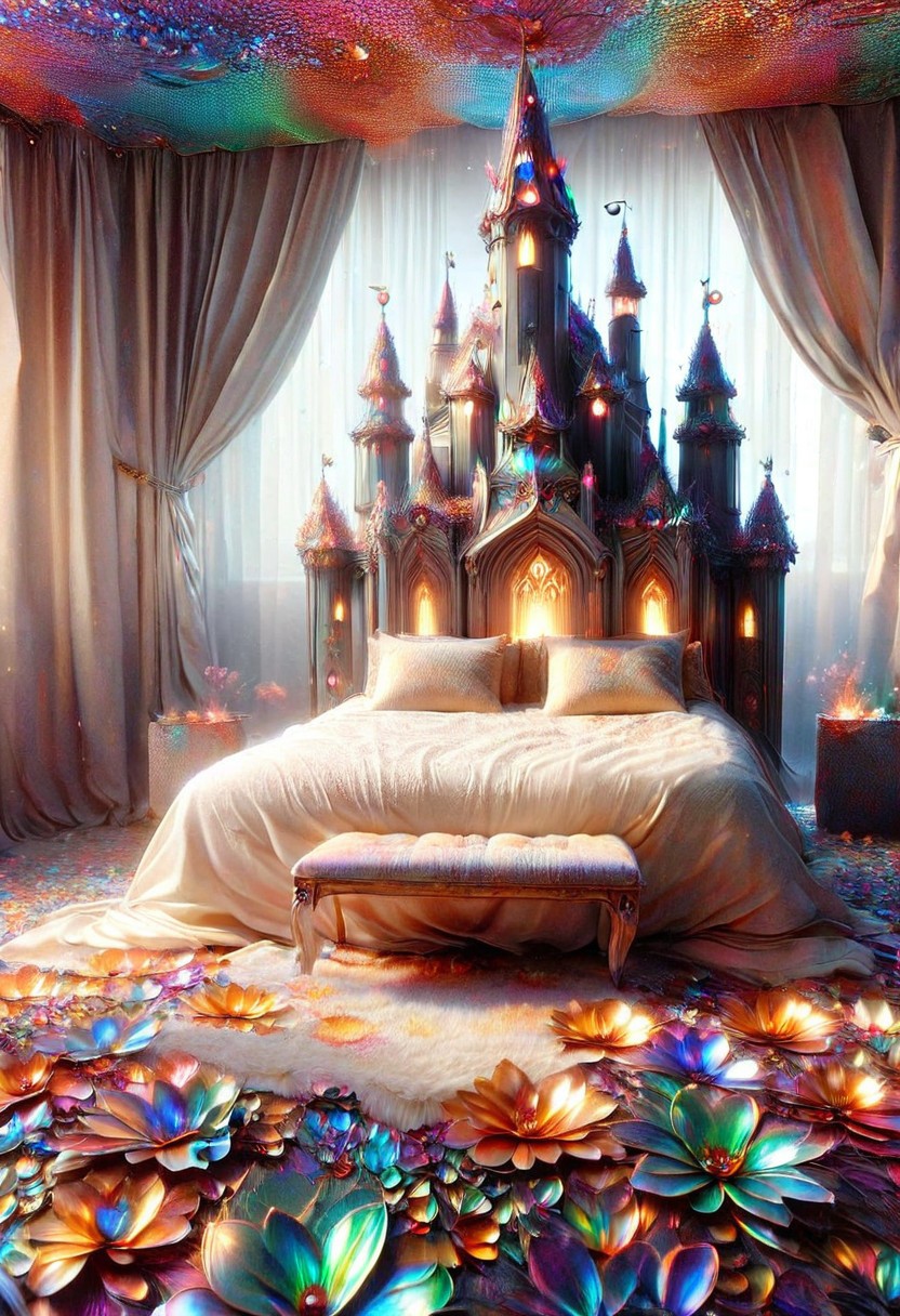 masterpiece, best quality, a snow-white cat with emerald eyes collapsed on the bed. the bed is covered with a sheet with a pattern of multi-colored colors. On the bedside table are flowers of unprecedented shape and beauty. the beige wallpaper ceilings are high, a picture hangs on the wall on which a castle of spires and towers is painted, the castle stands on a mountain, to which a path of flowers leads. 4k, 8k, cinematic lighting, amazing quality, wallpaper, < lora: aesthetic _ anime _ v1s: 1 > ral-smlvltnpls
