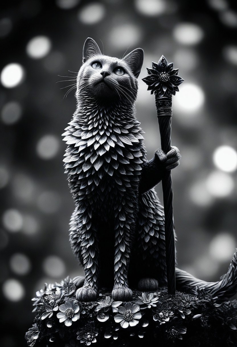 masterpiece,ultra-high resolution,incredible composition,extremely detailed, masterpiece, extremely detailed, sharp outlines, high contrast, fine details, intricate, photo of a sculpture of a p1nk1r1fl0wers cat dressed as a wizard, mage robes, staff, made out of iridescent flower petals intricate background, bokeh, inspiring, moody lights, neoclassical art style,