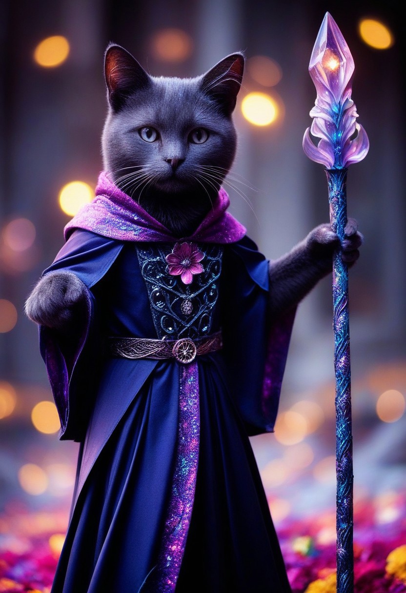 masterpiece,ultra-high resolution,incredible composition,extremely detailed, masterpiece, extremely detailed, sharp outlines, high contrast, fine details, intricate, photo of a sculpture of a p1nk1r1fl0wers cat dressed as a wizard, mage robes, staff, made out of iridescent flower petals intricate background, bokeh, inspiring, moody lights, neoclassical art style,