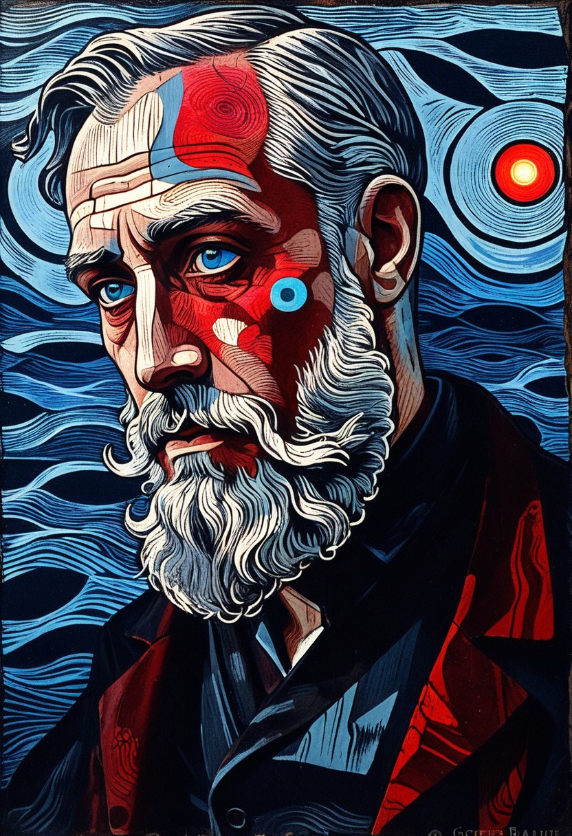 Stylized image of a man. Illustration. Striking. Scarlet red, black and sky blue. Cubist:1.3. Silver beard and hair with traces of coppery red hair. . Glowing eyes. striking, spirited, intriguing, colorful, ripples, splash, water circles, woodblock print, style of Georges Braque Model: (Marlon Brando:0.7), (Tom Hardy:0.3)