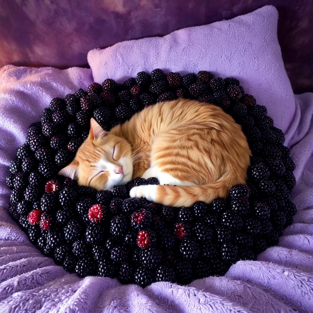 blackberryworld, (giant cat sleeping peacefully:1.5), (nestled in bed of blackberries:1.6), (cozy berry nest:1.4), soft fur, curled up feline, (dreamlike texture:1.3), (sweet surreal scene:1.3), soft purple lighting, warm ambient light, (fluffy blackberries:1.4), pastel tones, (whimsical fantasy:1.3), gentle composition, adorable mood