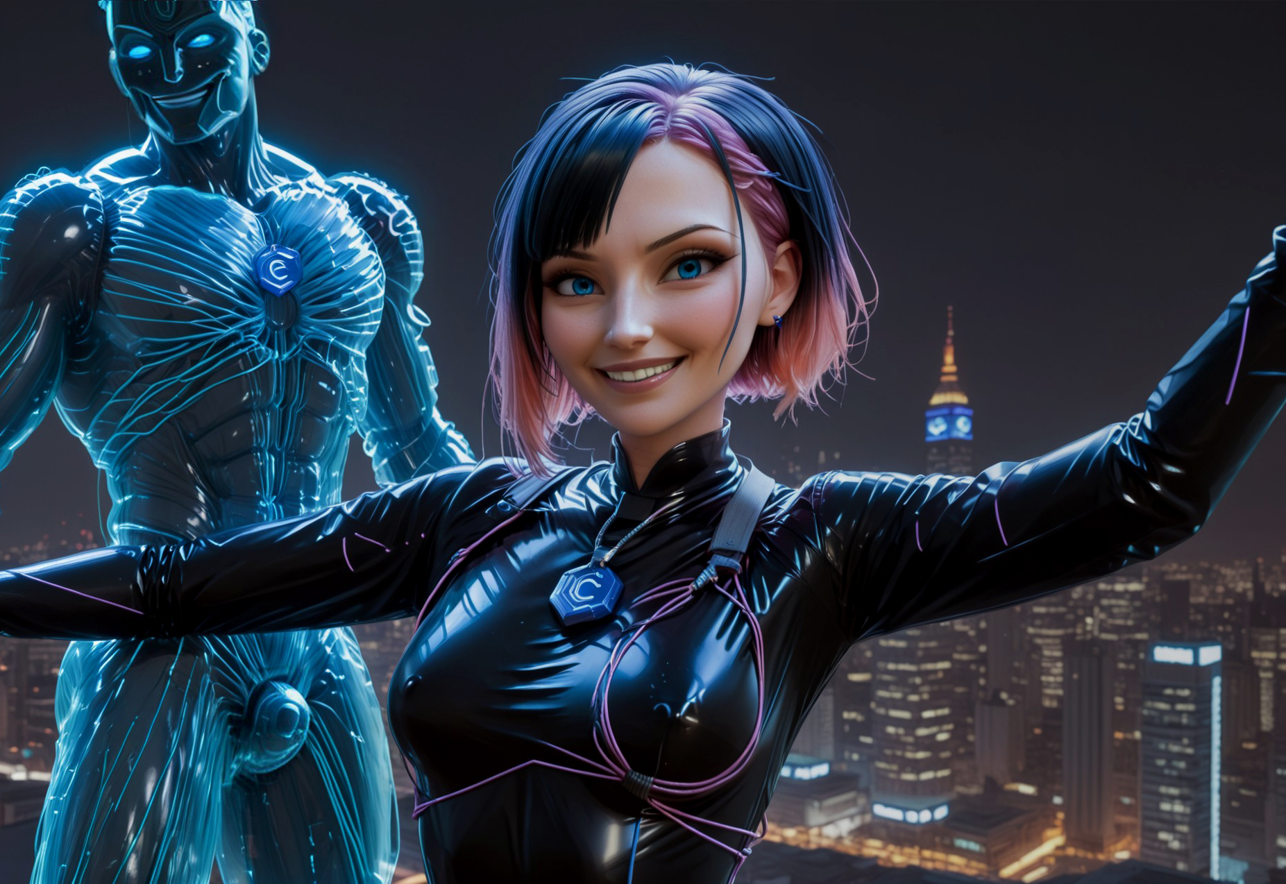(3 diffrents characters:2), best quality, good quality, very awa, very aesthetic, absurdres, newest, group, group shot, expressing love, hugging, holding together, 3 people hugging together, 2girls, and 1robot, (Ombre color scheme of neon blue,neon light orange ,neon orange ) made of, tiny neon glass filaments, w0gf1l:0.81, detailed hyperrealism, full-body, Civitai Logo medallion, head tilted, very high contrast, overhead lighting, 3D rendering, smiling, ,<region:0,0,0.5,1,1.5,1.5//cid=11> First character : civitchan, female, blue yes, black long hair made of filaments, body made of filaments, Second character : CivChan, female, purple eyes, pink hair made of filaments, short hair, Third character : civbot, blue robot, android, bot, male Background:cyber city skyline made of filaments,