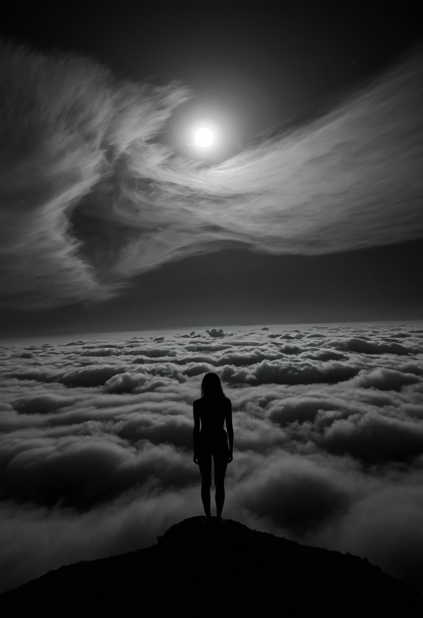 A high-angle black and white photograph depicts a solitary human silhouette in a wide shot standing upright on a bed of swirling clouds. The clouds create a misty, undulating landscape extending to the horizon. In the night sky above, a full moon appears partially obscured by billowing clouds, creating multiple layers of atmospheric depth. The moon's natural backlighting casts long dark shadows across the cloudscape while illuminating the entire scene with gradual transitions between light and dark gray tones. Black and white photography with wide-angle framing and dramatic backlighting creates high contrast between light and dark elements.