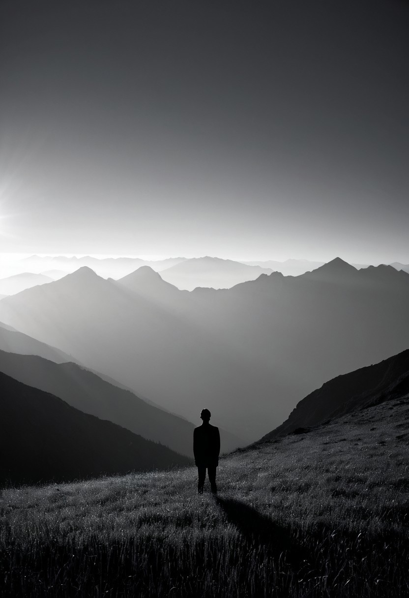A black and white landscape photograph captures a solitary human figure standing in silhouette against a backdrop of misty mountain ranges. The figure's entire form appears as a dark shape positioned in the center of the frame, surrounded by knee-height grass rendered in sharp detail. Multiple mountain ranges stretch across the horizon, each successive range appearing progressively lighter in tone due to atmospheric perspective, creating distinct layers of depth. Natural backlighting illuminates the scene from behind the mountains, casting long shadows through the grass and highlighting the figure's outlined form against the layered landscape. Black and white landscape photography with high contrast and soft atmospheric lighting.
