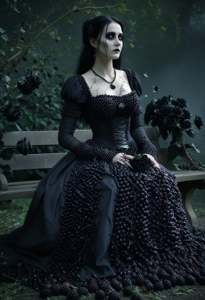 Masterpiece, High Details, High Quality, HD, woman, antique gothic dress, sleeves, dress Made of black berrys, jewelry, sitting on bench, in a black and withered garden, holding black roses, dark, mysterious, spooky, blackberryworld, Dynamic