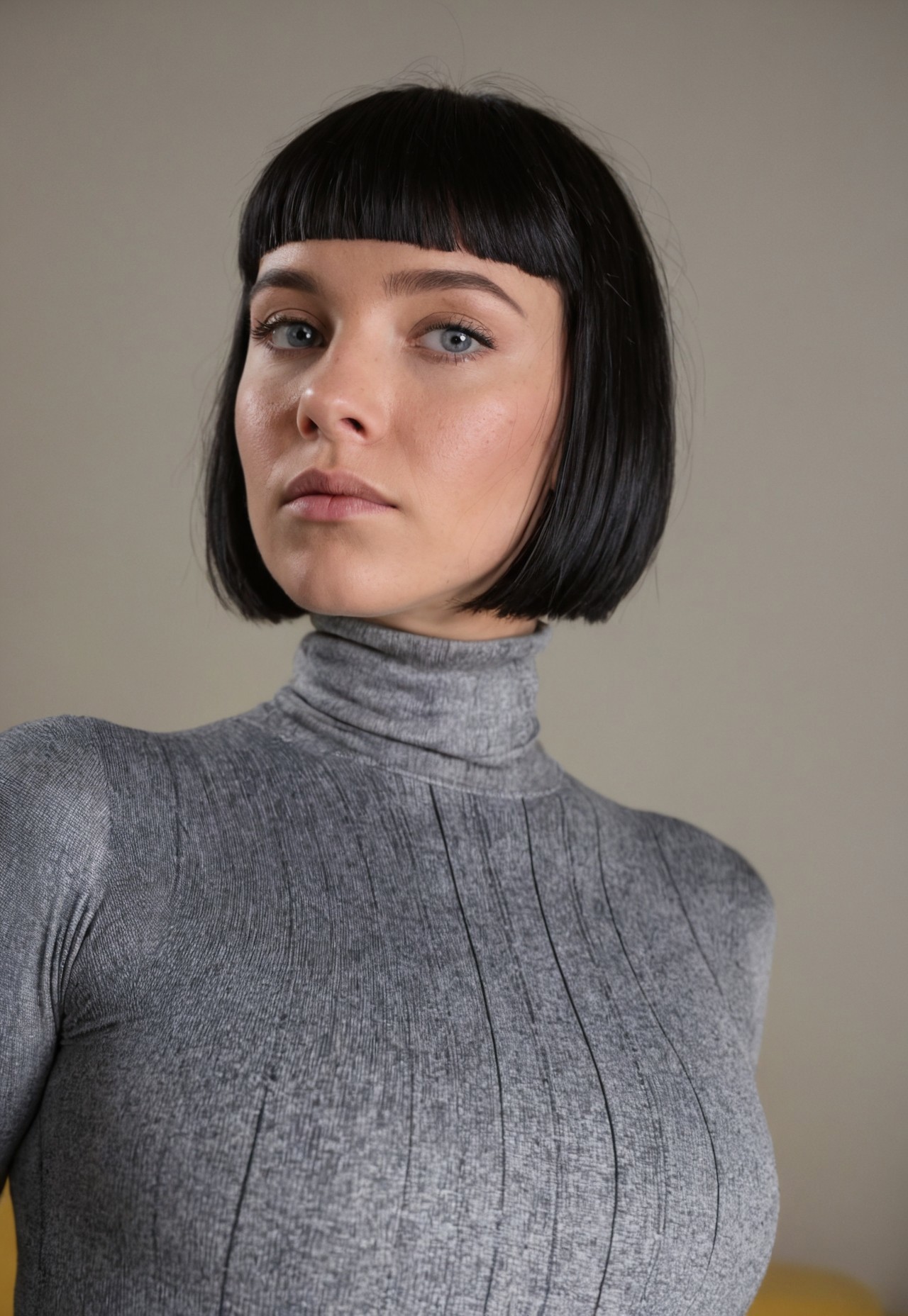 portrait, masterpiece, 4k, ray tracing, intricate details, highly-detailed, hyper-realistic, 8k RAW Editorial Photo. 1girl, solo, blush, short hair, lots of moles, beautiful, simple background, white turtle neck leotard, black hair, leather leotard, closed mouth, upper body, blunt bangs, grey eyes, barcode tattoo on arm, looking to the side, bob cut, yellow background, science fiction, science fiction logo on chest. Flatline, cinematic light, dramatic light, shallow depth of field, high budget, bokeh, cinemascope, film grain,