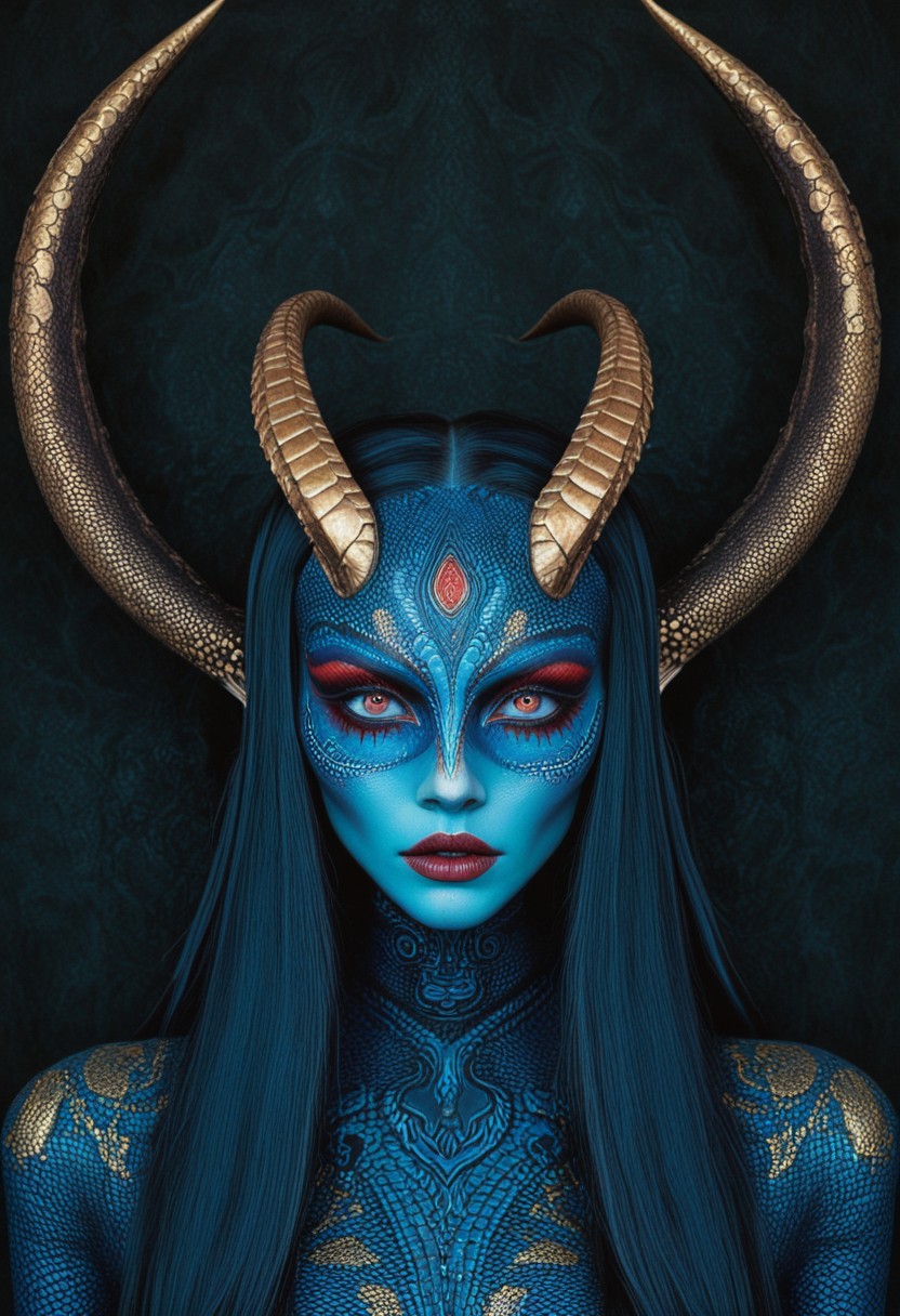 This is a highly detailed, digital artwork in a surreal, fantasy style. The image showcases a close-up portrait of a humanoid figure with an otherworldly appearance. The subject is a woman with an elongated, elongated skull and elongated, pointed ears, which are adorned with intricate, scale-like patterns that blend seamlessly into her skin. Her skin has a smooth, almost iridescent quality, shifting between shades of deep blue and pale blue. Her eyes are large, almond-shaped, and an intense, glowing blue, giving an ethereal quality to her gaze. She has a delicate, almost translucent, blue and gold pattern on her face that mimics the texture of reptilian skin, enhancing the fantastical nature of her appearance. Her lips are full and painted a deep, rich red, adding a pop of color against her pale skin. The background is a deep, dark gradient, which enhances the subject and creates a dramatic, high-contrast effect, making her features stand out sharply. The texture of her skin and the patterns on her face have a high level of detail, with realistic, almost tactile quality. The overall atmosphere of the image is one of mystery and otherworldliness, blending elements of fantasy and surrealism.