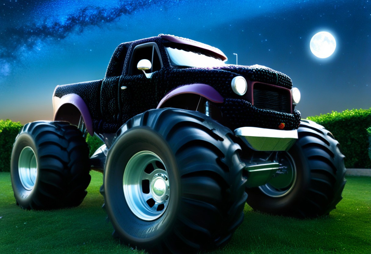 score_10, score_9_up, score_8_up, score_7_up, score_6_up, vibrant colors, shiny skin, prefect lighting, detailed image, snoozing, masterpiece, best quality, highly detailed, ultra quality, BREAK, blackberryworld, newfantasycore, Monster truck made out of blackberryworld , On the road, detailed background, garden, night, moon, starry sky, stars,