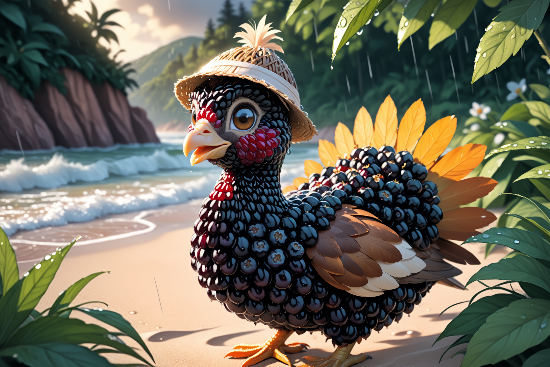 blackberryworld,, , a cute baby turkey with soft brown feathers, small beak, big eyes, solo, with chocolate brown fur, rich and deep, sneaky glance, eyes narrowed, small smirk, a sunny forest glade with dappled sunlight, soft grass, wildflowers, detailed background, hiding in a bush, eyes peeking, surprised, mouth open, back shot, character facing away, a sunset beach play with animals splashing, gentle waves, sunset beach, a tiny hat, perched on its head, on soft straw, warm and cozy, stormy, dark clouds, lightning flashes, rain falling, noon, bright overhead sun, clear shadows, warm air, best quality, vibrant colors, realistic style, high detail, high-definition, hyper-realistic, extremely high-resolution details, fine texture, incredibly lifelike, realistic, not cartoon, not drawing, highres, 4K resolution, source photo, realistic photo, masterpiece, best quality, amazing quality, very aesthetic, ultra-detailed, detailed textures, natural lighting, soft light, sunset oranges, warm and glowing, soft light, dynamic angle, wide shot, <lora:Blackberryworld_Morth:1.5>