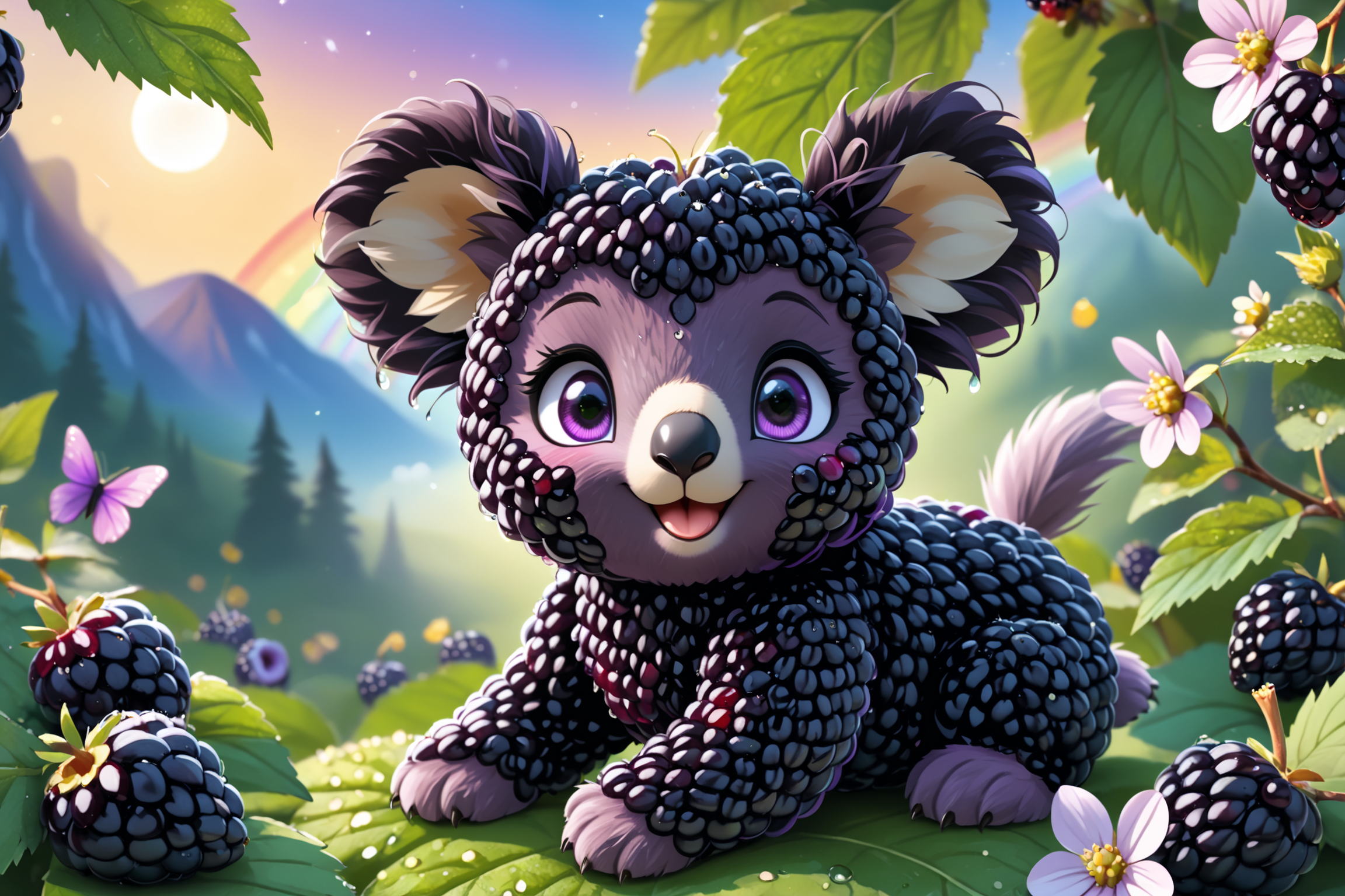 a tiny koala with round ears, clinging to a blackberry vine branch, gray fur, solo, blackberryworld, with pastel purple fur, dreamy and light, glowing with a blackberry aura, blackberryworld, silly grin while rolling in blackberry juice, tongue out, eyes wide, blackberryworld, a flower field with colorful wildflowers, buzzing bees, soft breeze, now transformed by blackberryworld with wildflowers dripping with purple juice, blackberry vines sprawling, and berry flowers blooming, detailed background, napping on a blackberry vine leaf, tiny snores, blackberryworld, gleeful while rolling in blackberry juice, eyes sparkling, blackberryworld, portrait focus, close-up shot, a blackberryworld butterfly chase with animals running, blackberry butterflies fluttering, rainbow meadow transformed by blackberryworld, a fluffy blackberry toy, hugged closely, blackberryworld, on soft straw with blackberry vines, warm and cozy, blackberryworld, night with blackberry glow, starry sky, moonlight with a purple tint, cool shadows, blackberryworld, late morning, warm sunlight with blackberry sparkles, soft breeze, clear skies, blackberryworld, best quality, vibrant colors, cartoon style, soft shading, high detail, smooth texture, not realistic, not photorealistic, highres, 4K resolution, masterpiece, best quality, amazing quality, very aesthetic, soft light, sunset oranges with blackberry purples, warm oranges with purple shimmer, blackberryworld, gentle glow with blackberry shimmer, soft purple light, blackberryworld, dynamic angle, wide shot, <lora:Blackberryworld_Morth:1>