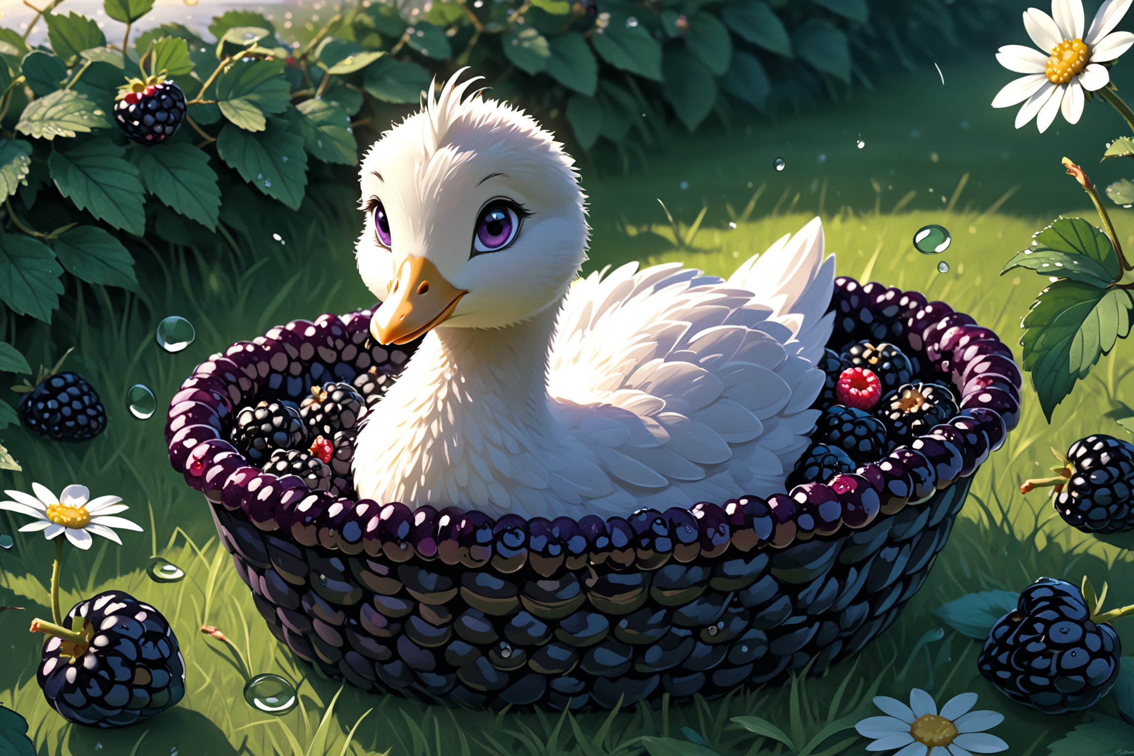 a cute baby goose with soft gray feathers, small beak, big eyes, splashing in blackberry juice, solo, blackberryworld, with chocolate brown fur, rich and deep, dripping with blackberry juice, blackberryworld, excited look while chasing a blackberry butterfly, wide eyes, ears up, blackberryworld, a spring meadow with fresh grass, blooming daisies, soft sunlight, now transformed by blackberryworld with grass covered in blackberry vines, purple juice puddles, and berry flowers blooming, detailed background, napping in a basket lined with blackberry vines, tiny snores, blackberryworld, excited while chasing a blackberry butterfly, eyes wide, blackberryworld, action focus, medium shot, a blackberryworld sunset beach play with animals splashing in blackberry juice waves, sunset beach transformed by blackberryworld, a fluffy blackberry juice balloon, floating nearby, blackberryworld, on a grassy hill with blackberry vines, green and sloping, purple juice puddles, blackberryworld, rainy with blackberry juice, purple juice falling, muddy ground, overcast sky, blackberryworld, afternoon, golden sunlight with blackberry glow, long shadows, warm breeze, blackberryworld, best quality, vibrant colors, realistic style, high detail, high-definition, hyper-realistic, extremely high-resolution details, fine texture, incredibly lifelike, realistic, not cartoon, not drawing, highres, 4K resolution, source photo, realistic photo, masterpiece, best quality, amazing quality, very aesthetic, ultra-detailed, detailed textures, natural lighting, soft light, soft gradients with blackberry purples, gentle purples and oranges, blackberryworld, warm light with blackberry sparkles, purple accents, blackberryworld, dynamic angle, wide shot, <lora:Blackberryworld_Morth:1>