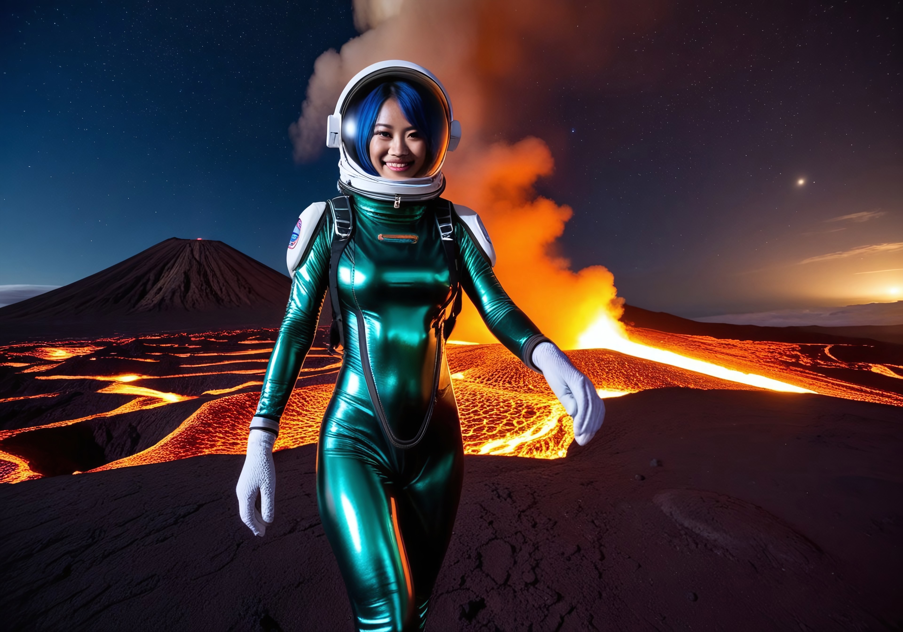 safe_pos, (astronaut), blue hair, (Thai woman), short hair, (highly detailed beautiful face), cowboy shot, high detailed ultra-futurist form-fitting spacesuit, (emerald metallic spacesuit), (thin full-body covering spacesuit), (wearing spacesuit bubble-helmet), (wearing spacesuit gloves), (textured clothing), (ultra-detailed body), (dynamic angle), seductive, smiling, (depth of field), (fine textures details), (external oxygen backpack), enormous bosom, large breasts, (walking next to a caldera), (on top of a volcano), (alien lava planet), (dark night), (night sky), space, full body portrait