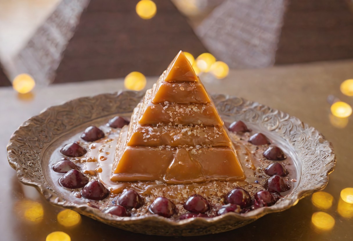 masterpiece, 4k, ray tracing, intricate details, highly-detailed, hyper-realistic, 8k RAW Editorial Photo. Fancy plate, pyramid made of caramel, cherry on top , cinematic light, dramatic light, shallow depth of field, high budget, bokeh, cinemascope