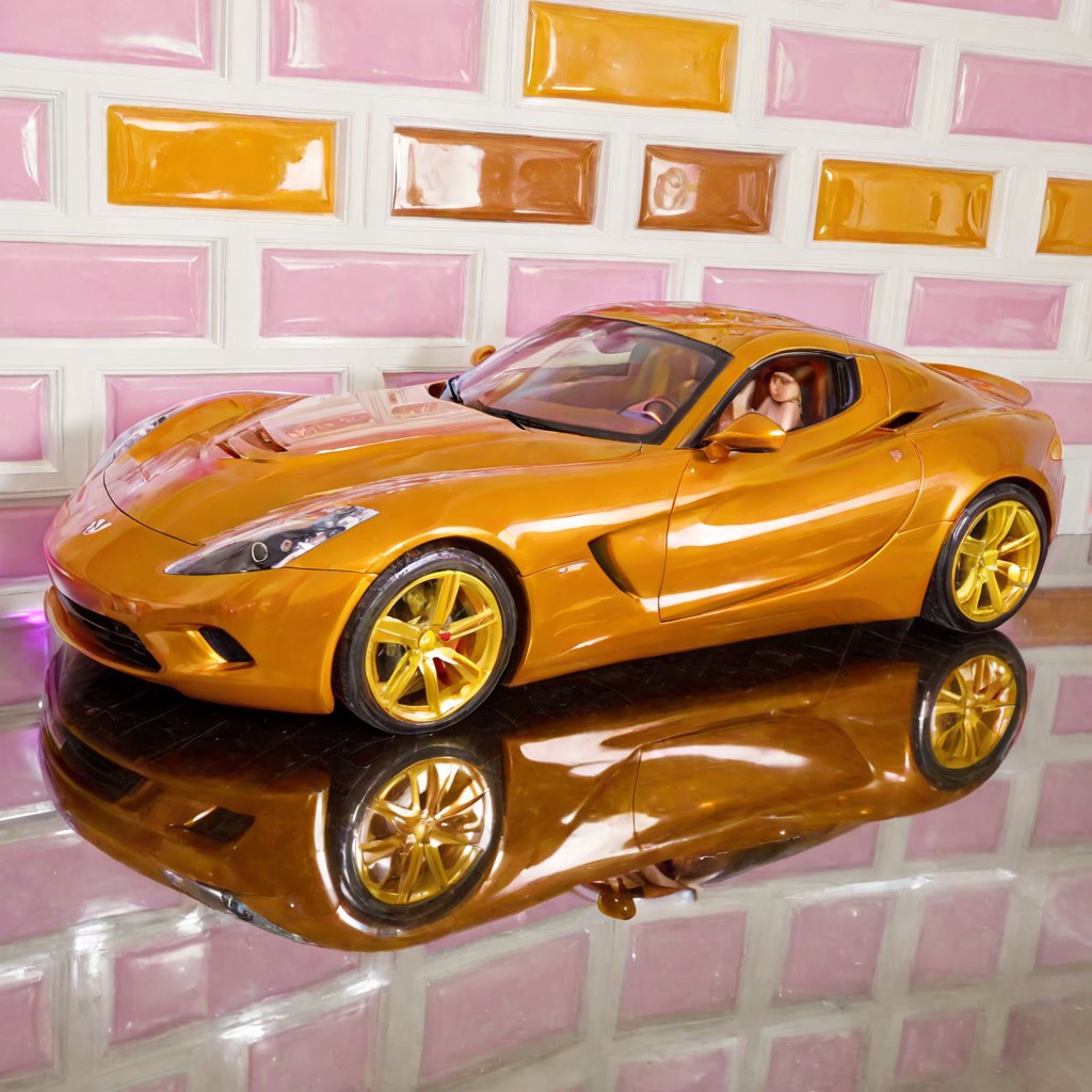 (candy sports car:1.6), (caramel bodywork:1.5), (glossy sugar coating:1.4), (golden syrup reflection:1.4), sleek futuristic design, edible texture, parked on a colorful candy road, (toffee tires:1.3), transparent sugar windows, (highly reflective candy paint:1.5), chocolate dashboard, jellybean headlights, whimsical style, soft studio lighting, vibrant color palette