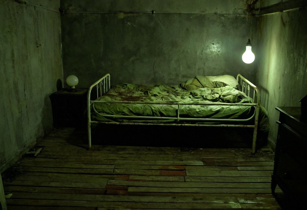 Authentic share, amateur, nfsw, beautiful,grainy picture,((natural pretty light)), ,amateur photography ultra-realistic:1.5, indoor, ((A dark room with a dull gray and worn walls. A window reveals a foggy exterior, contributing to the sense of confinement. A single, simple dirty, bare light bulb hangs from the ceiling, diffusing a light too dim to illuminate the room, A rusty white metal bed, covered with greenish dirty, wrinkled bedding, and a dark nightstand holds an unlit lamp. The floor is made of dark, uneven wooden planks. The entire room exudes a feeling of emptiness, coldness, and neglect))