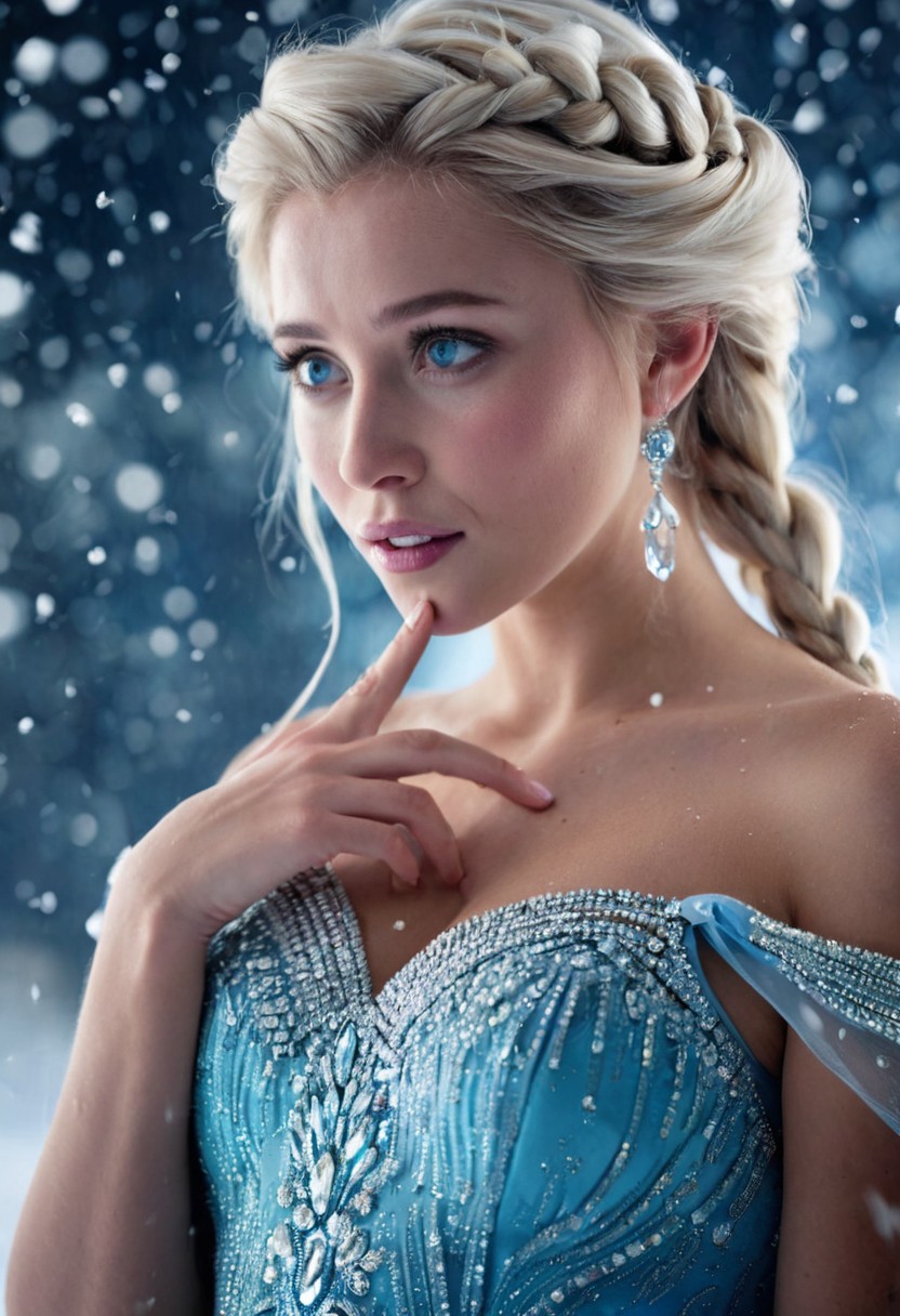 masterpiece, 4k, ray tracing, intricate details, highly-detailed, hyper-realistic, 8k RAW Editorial Photo. frozen ,elsa,looking at camera,crown braid, dreamy expression, blue eyes, dress, fair skin, princess dress, snowing, dress made of crystals, flirting, hand to cheek, thinking, blushing, , cinematic light, dramatic light, shallow depth of field, high budget, bokeh, cinemascope