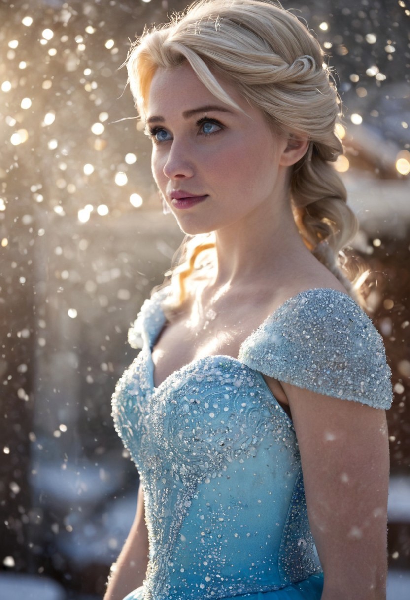masterpiece, 4k, ray tracing, intricate details, highly-detailed, hyper-realistic, 8k RAW Editorial Photo. frozen ,elsa,looking at viewer, shy, blue eyes, dress, fair skin, princess dress, snowing, dress made of crystals, flirting, cowboy shot, , cinematic light, dramatic light, shallow depth of field, high budget, bokeh, cinemascope