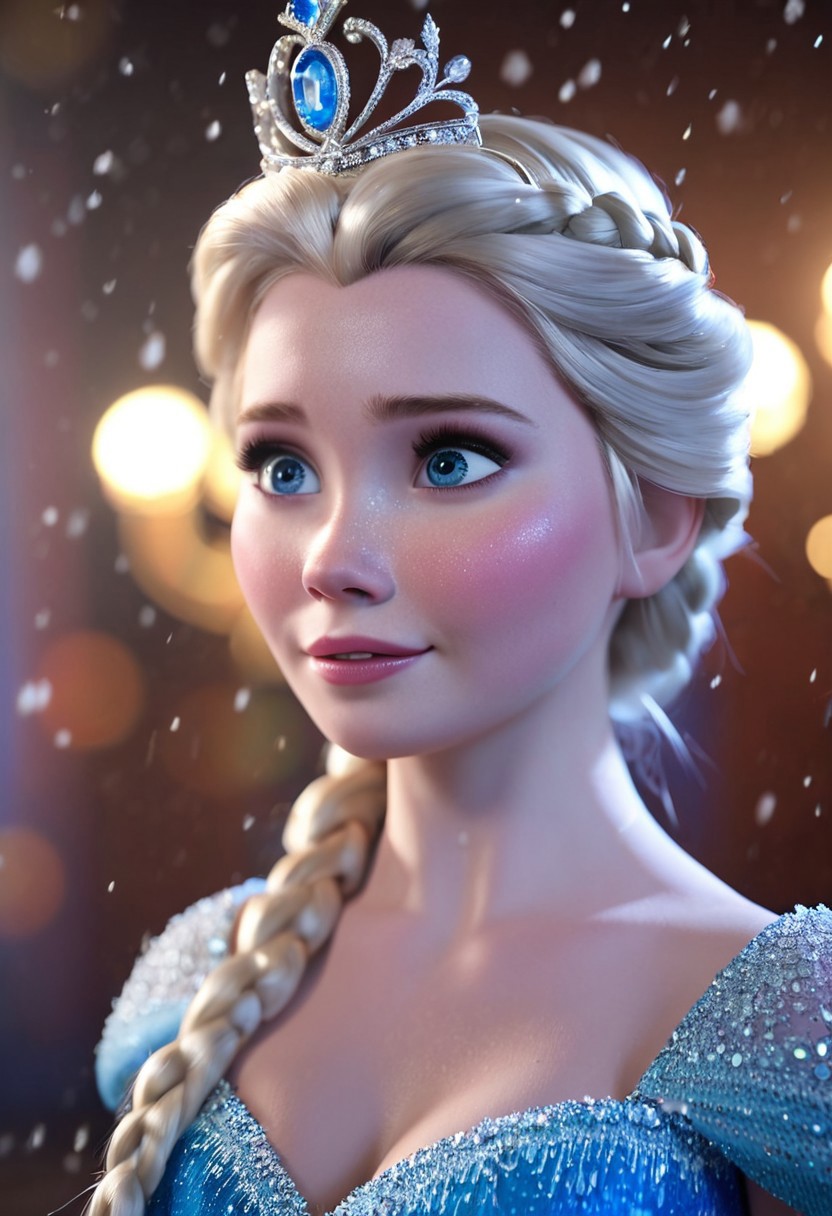 masterpiece, 4k, ray tracing, intricate details, highly-detailed, hyper-realistic, Cgi,Disney, pixar, frozen ,elsa,looking at viewer, portrait ,crown braid, daydreamimg, blue eyes, dress, pale skin, princess dress, snowing, dress made of crystals, blushing, , cinematic light, dramatic light, shallow depth of field, high budget, bokeh, cinemascope