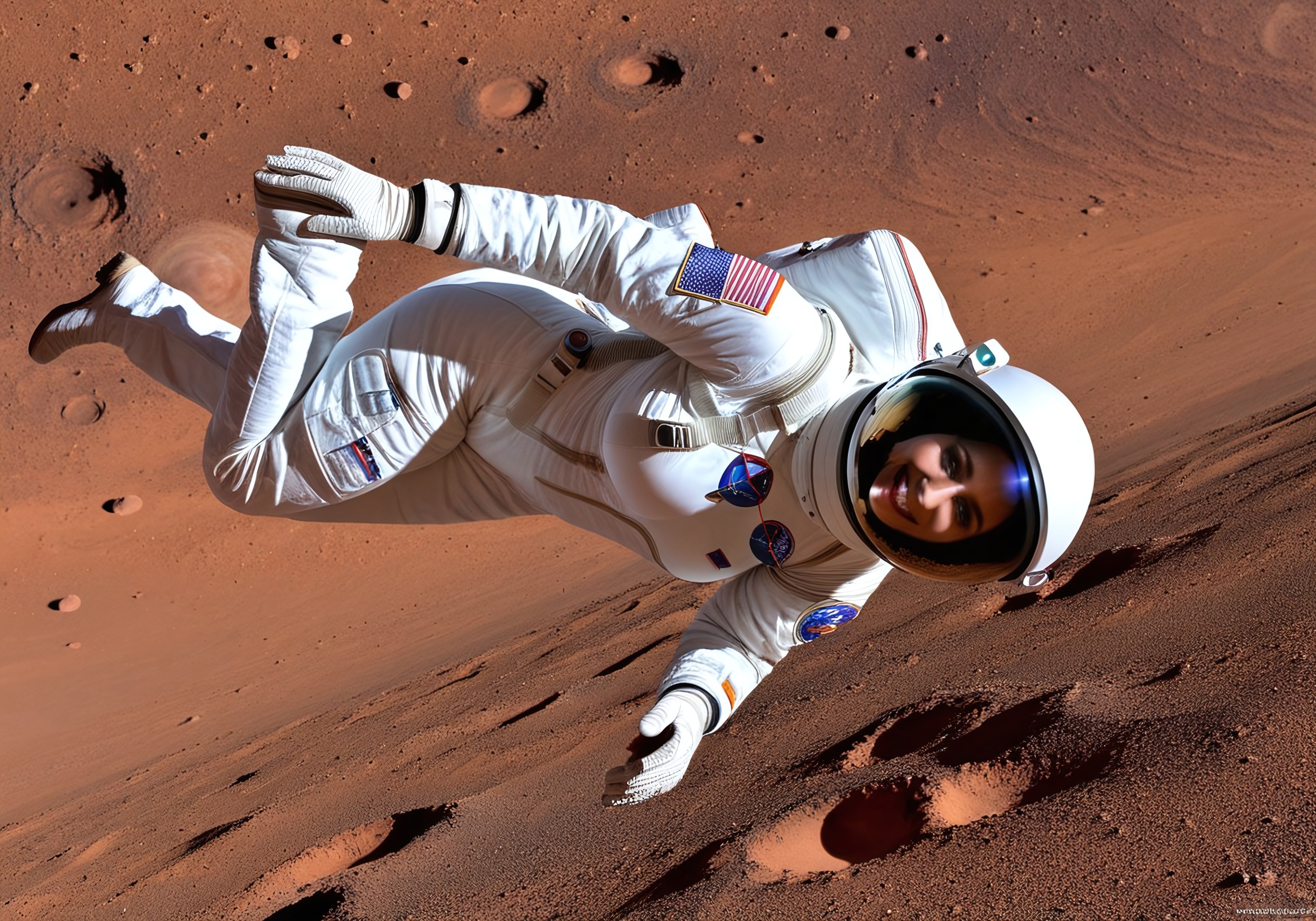 safe_pos, (astronaut), dark hair, (Arabic woman), short hair, (highly detailed beautiful face), cowboy shot, high detailed ultra-futurist form-fitting spacesuit, (white cloth spacesuit), (full-body covering spacesuit), (wearing spacesuit bubble-helmet), (wearing spacesuit gloves), (textured clothing), (ultra-detailed body), (dynamic angle), (depth of field), (fine textures details), (external oxygen backpack), smiling, sexy, enormous bosom, large breasts, (hopping in low gravity), (on Mars), (dark night), space, full body portrait
