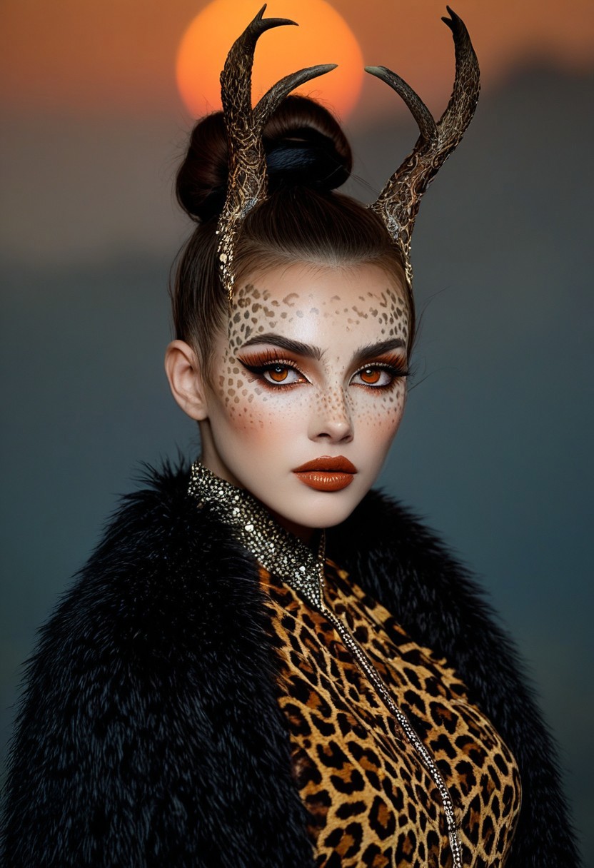 This is an award winning UHD sci-fi movie still, highly stylized photographic masterpiece featuring a young woman with a striking, ethereal appearance. The subject is a light-skinned woman with a delicate, almost androgynous face, adorned with intricate, leopard-like spots on her face and neck, mimicking the pattern of a giraffe. Her hair is styled in a sleek, high bun with two small, dark, antler-like structures protruding from the top, giving her a mythical, otherworldly appearance. Her eyes are large and expressive, with dramatic, elongated eyeliner and mascara that accentuates her almond-shaped eyes. She is dressed in a dark, fur-like garment, possibly a cloak or shawl, draped over her shoulders, adding a touch of wild, exotic elegance, suggesting a moment of deep thought or reverence. The background is a soft, blurred gradient of warm, earthy tones, possibly depicting a sunset or a forest, with a focus on a rich, burnt orange hue that contrasts beautifully with her pale skin and the dark fur. The overall style of the artwork is highly detailed and realistic, with a focus on texture and light, creating a surreal, almost dreamlike atmosphere.