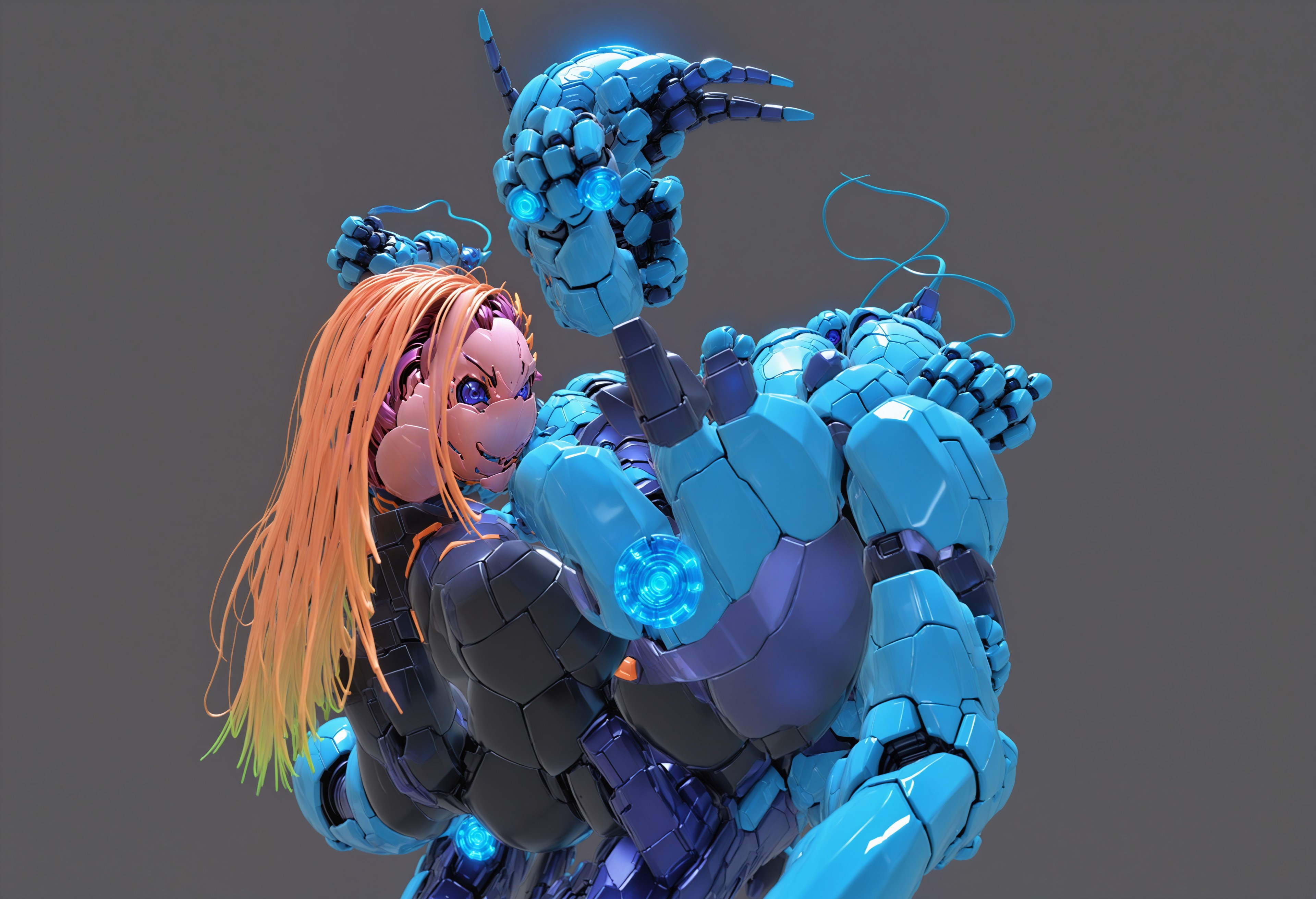(3 diffrents characters:2), best quality, good quality, very awa, very aesthetic, absurdres, newest, group, group shot, expressing love, hugging, CivBot, CivChan and civitchan holding together, 3 people hugging together, 2girls, and 1robot, (Ombre color scheme of neon blue,neon light orange ,neon orange ) made of, tiny neon glass filaments, w0gf1l:0.81, Manga style, detailed hyperrealism, full-body automaton (CivBot, blue robot), Civitai Logo medallion, head tilted, very high contrast, overhead lighting, 3D rendering, 4, smiling, holographic text:"BUZZ" coins floating around, First character : CivChan, purple eyes, pink hair made of filaments, short hair, Second character : CivBot, civitchan, blue yes, black long hair made of filaments, body made of filaments, Third character : android, bot, Background:cyber bedroom,