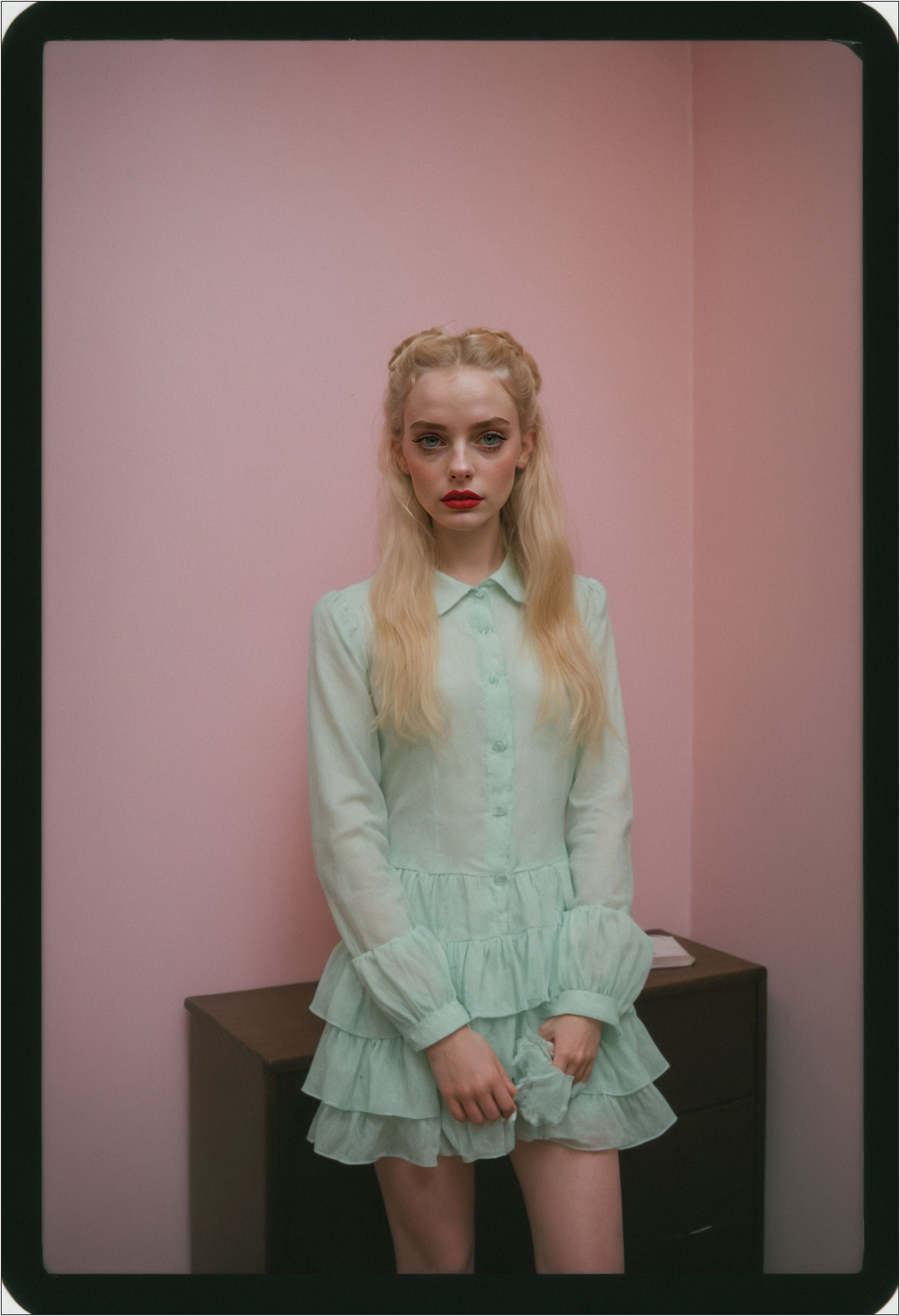 The scene is a dark academia library, bookshelf, indoors. A skinny egirlmakeup 4ng3l face woman stands alone and glowing. The scene is captured on Polaroid and Hasselblad 120mm medium format film, giving it a dreamy, nostalgic quality. The woman, who appears to be around 21 years old, is petite with long legs and porcelain skin. She is dressed in a random outfit and tall high-heel shoes. Her clothes are frilly and feminine, and her long blonde hair cascades down her back in loose waves. Her lips are painted a glossy red, and her eyes are framed by realistic dark mascara. Worried expression. Seafoam-green and pastel-pink colored smoke, <lora:detailed_hands-000007:0.8>