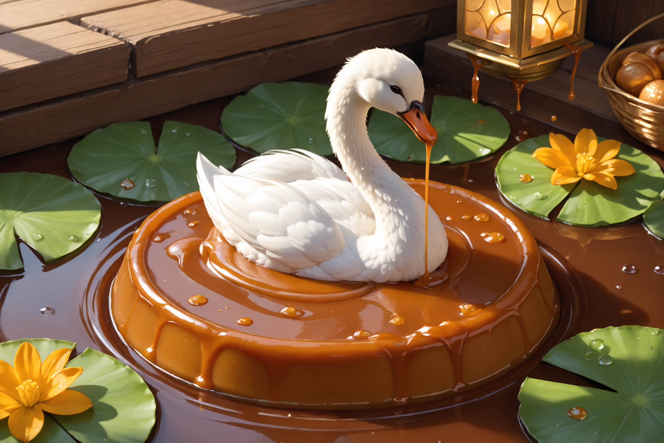 a tiny swan with white feathers, long neck, small beak, feathers with caramel shimmer, solo, caramel, caramel sauce, with caramel cream fur, soft and creamy with a subtle glow, caramel, caramel sauce, nuzzling look with caramel sweetness, eyes closed, nose twitching, caramel, caramel sauce, a cozy attic with caramel wooden beams, soft blankets with caramel patterns, warm caramel lantern light, detailed background, caramel, caramel sauce, rolling a caramel hoop like a circus star, ears flapping, caramel hoop spinning with sparkles, caramel, caramel sauce, happy, ears perked with caramel joy in its eyes, caramel, caramel sauce, three-quarter view shot, full body visible, a spring meadow play with animals playing caramel hopscotch, caramel daisies blooming, caramel meadow, caramel, caramel sauce, a caramel ball, glowing softly, rolling nearby, caramel, caramel sauce, on a caramel lily pad, green and floating with caramel shimmer, caramel, caramel sauce, humid with caramel mist, misty air with caramel scent, dewdrops of caramel on surfaces, warm caramel atmosphere, caramel, caramel sauce, early afternoon with bright caramel sunlight, warm caramel breeze, long caramel shadows, caramel, caramel sauce, best quality, vibrant colors, cartoon style, soft shading, high detail, smooth texture, not realistic, not photorealistic, highres, 4K resolution, masterpiece, best quality, amazing quality, very aesthetic, soft light, caramel, caramel sauce, toffee shimmer tones, golden caramel with a shimmering glow, caramel, caramel sauce, caramel dawn light, soft pink and caramel glow, caramel, caramel sauce, side profile shot, full body visible, <lora:caramel gmr lora:0.5>