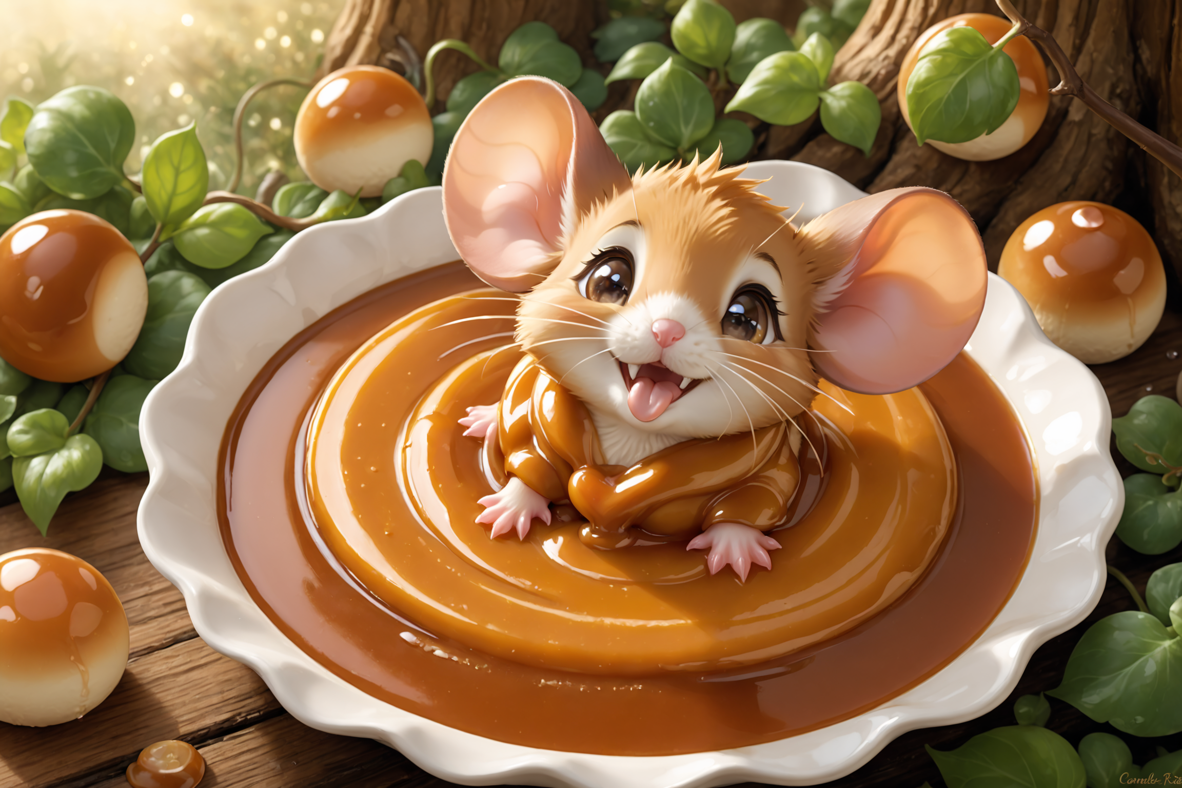 a little mouse with small ears, whiskers, caramel-shimmer fur with a soft glow, solo, caramel, caramel sauce, with dulce de leche fur, rich and deep with a warm radiance, caramel, caramel sauce, silly grin with caramel playfulness, tongue out, eyes wide, caramel, caramel sauce, a cozy forest with caramel-dripped vines, trees with caramel bark, dappled sunlight with caramel glow, detailed background, caramel, caramel sauce, playing with caramel marbles, rolling them with paws, caramel marbles glowing softly, caramel, caramel sauce, adoring, heart-shaped eyes with caramel sparkles, caramel, caramel sauce, portrait focus, close-up shot, a pastel valley picnic with animals sharing caramel treats, tiny caramel baskets, caramel pastel valley, caramel, caramel sauce, a tiny caramel backpack, on its back, caramel, caramel sauce, on a caramel mushroom cap, soft and glowing with caramel light, caramel, caramel sauce, humid with caramel mist, misty air with caramel scent, dewdrops of caramel on surfaces, warm caramel atmosphere, caramel, caramel sauce, dawn with caramel radiance, soft pink and orange hues with caramel glow, early caramel light, fresh air with caramel scent, caramel, caramel sauce, best quality, vibrant colors, realistic style, high detail, high-definition, hyper-realistic, extremely high-resolution details, fine texture, incredibly lifelike, realistic, not cartoon, not drawing, highres, 4K resolution, source photo, realistic photo, masterpiece, best quality, amazing quality, very aesthetic, ultra-detailed, detailed textures, natural lighting, soft light, caramel, caramel sauce, caramel cream tones, soft and creamy caramel shades with a subtle glow, caramel, caramel sauce, gentle caramel glow, soft and soothing, caramel, caramel sauce, dynamic angle, wide shot, <lora:caramel gmr lora:0.5>