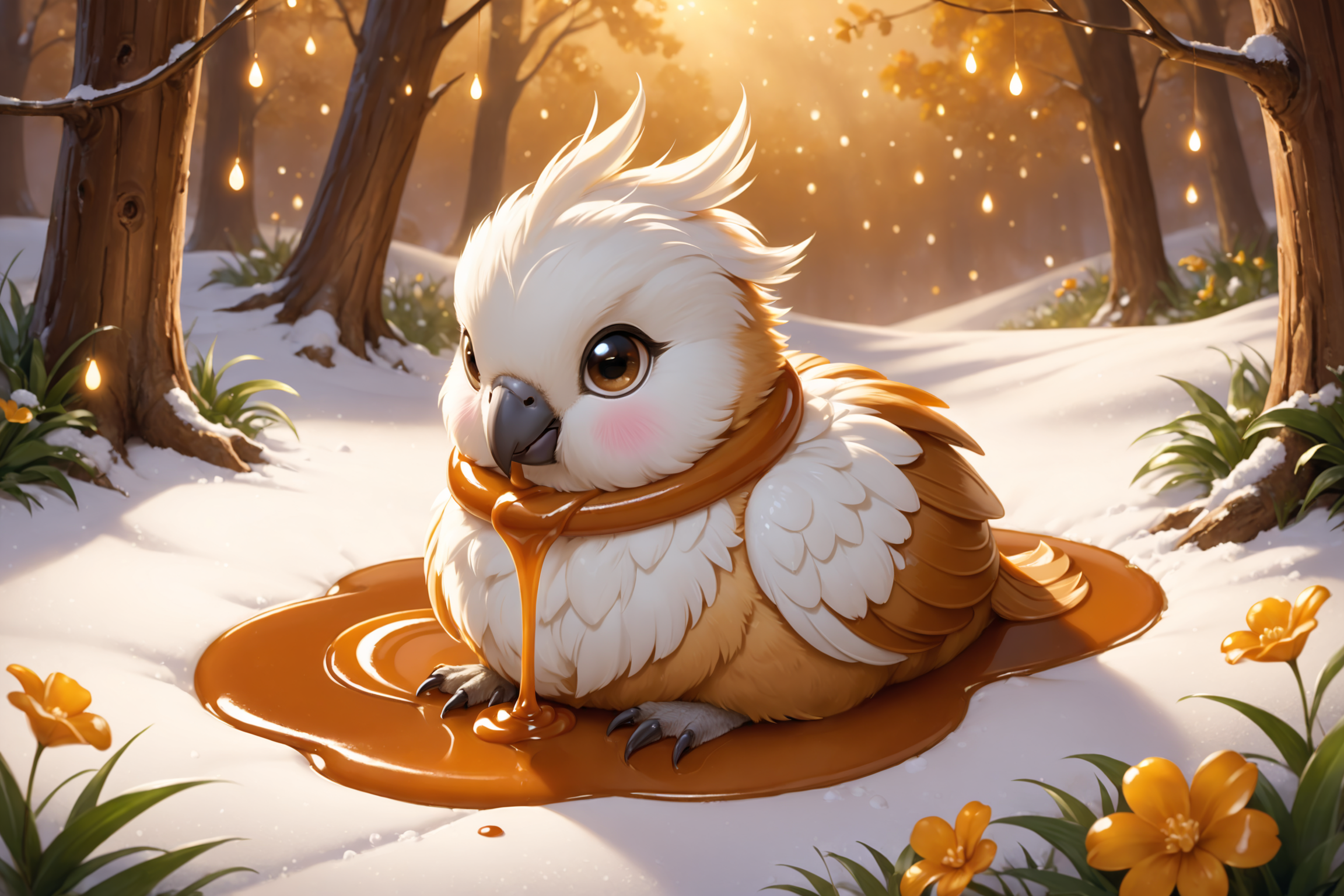 a cute baby cockatoo with white feathers, small crest, big eyes, feathers with caramel shimmer, solo, caramel, caramel sauce, with caramel swirl fur, creamy with golden swirls and a glossy finish, caramel, caramel sauce, cozy expression with caramel warmth, eyes soft, curled up, caramel, caramel sauce, a spring forest with blooming trees with caramel sparkles, soft caramel-sparkled grass, chirping birds with caramel wings, detailed background, caramel, caramel sauce, chasing a caramel-glowing firefly, tail wagging, caramel light trailing behind, caramel, caramel sauce, gentle, soft gaze with caramel warmth, caramel, caramel sauce, environment focus, wide shot, a snowy burrow cuddle with animals snuggling, warm caramel glow, caramel burrow, caramel, caramel sauce, tiny caramel glasses, perched on its nose, caramel, caramel sauce, on caramel pink sand, soft and warm with caramel shimmer, caramel, caramel sauce, humid with caramel mist, misty air with caramel scent, dewdrops of caramel on surfaces, warm caramel atmosphere, caramel, caramel sauce, midnight with dark starry sky, caramel moonlight, cool stillness with caramel glow, caramel, caramel sauce, best quality, vibrant colors, photorealistic style, high detail, high-definition, hyper-realistic, extremely high-resolution details, fine texture, incredibly lifelike, realistic, not cartoon, not drawing, highres, 4K resolution, source photo, realistic photo, masterpiece, best quality, amazing quality, very aesthetic, ultra-detailed, detailed textures, natural lighting, soft lighting, caramel, caramel sauce, caramel amber tones, warm and glossy caramel hues, caramel, caramel sauce, caramel sunlight, bright natural caramel glow, caramel, caramel sauce, back shot, character facing away, <lora:caramel gmr lora:0.5>