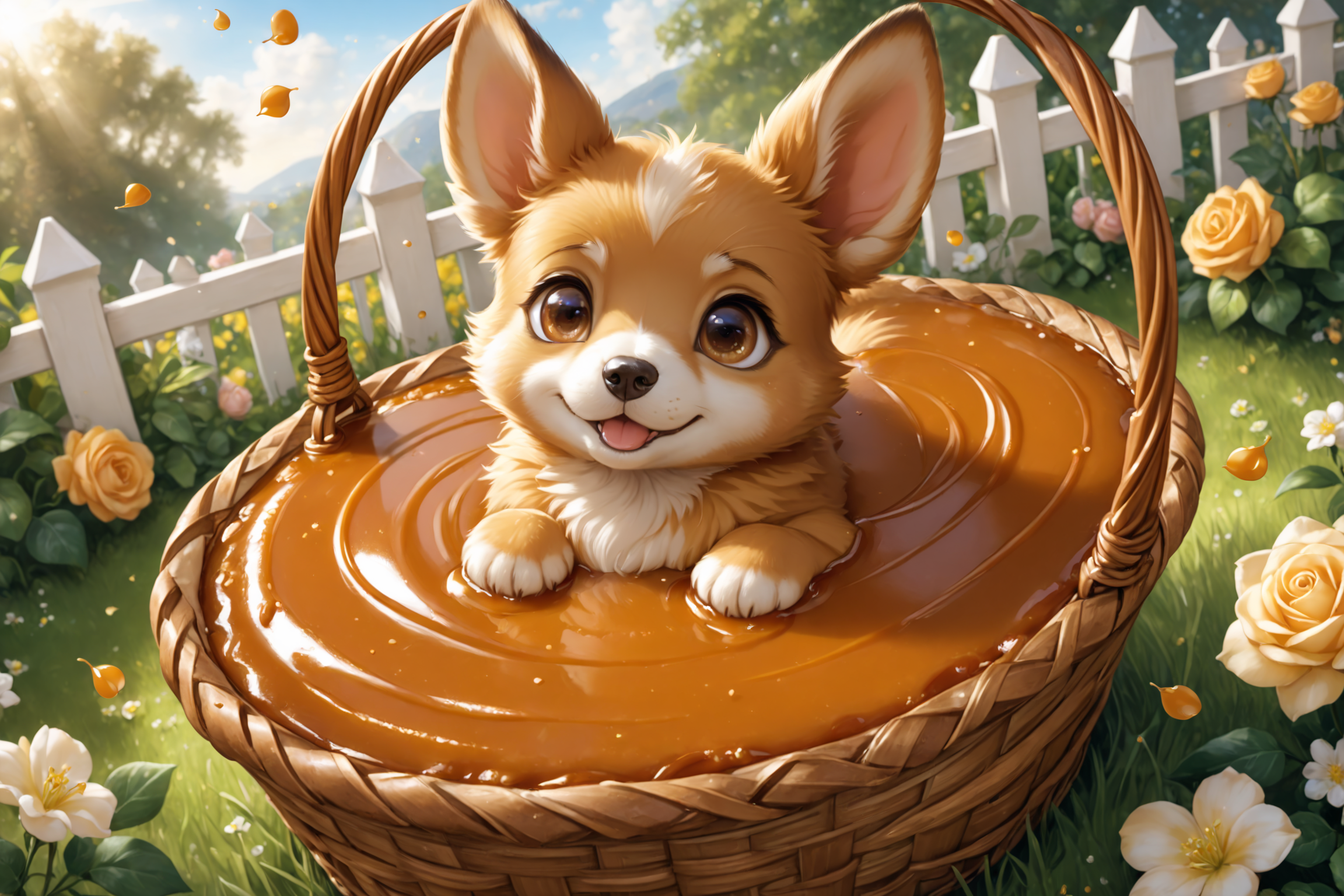 a curious puppy with floppy ears, wagging tail, toffee-glow fur with a silky texture, solo, caramel, caramel sauce, with golden syrup fur, sticky and glowing with a bright sheen, caramel, caramel sauce, timid gaze with caramel shyness, eyes wide, ears back, caramel, caramel sauce, a cozy cottage garden with caramel roses, caramel picket fence, soft sunlight with caramel glow, detailed background, caramel, caramel sauce, weaving a caramel basket with tiny paws, ears perked, caramel strands glowing softly, caramel, caramel sauce, adoring, heart-shaped eyes with caramel sparkles, caramel, caramel sauce, environment focus, wide shot, a flower festival with animals dancing among caramel flowers, caramel petals swirling, caramel garden, caramel, caramel sauce, a caramel plushie, hugged closely, caramel, caramel sauce, on soft grass with caramel sparkles, green and plush, caramel, caramel sauce, sunny with caramel mist, bright caramel-tinted sunlight, clear skies, warm caramel glow, caramel, caramel sauce, afternoon with golden caramel sunlight, long caramel shadows, warm caramel breeze, caramel, caramel sauce, best quality, vibrant colors, realistic style, high detail, high-definition, hyper-realistic, extremely high-resolution details, fine texture, incredibly lifelike, realistic, not cartoon, not drawing, highres, 4K resolution, source photo, realistic photo, masterpiece, best quality, amazing quality, very aesthetic, ultra-detailed, detailed textures, natural lighting, soft light, caramel, caramel sauce, honey toffee tones, warm and sticky caramel hues with a soft radiance, caramel, caramel sauce, caramel moonlight, cool caramel silver glow, caramel, caramel sauce, dynamic angle, wide shot, <lora:caramel gmr lora:0.5>