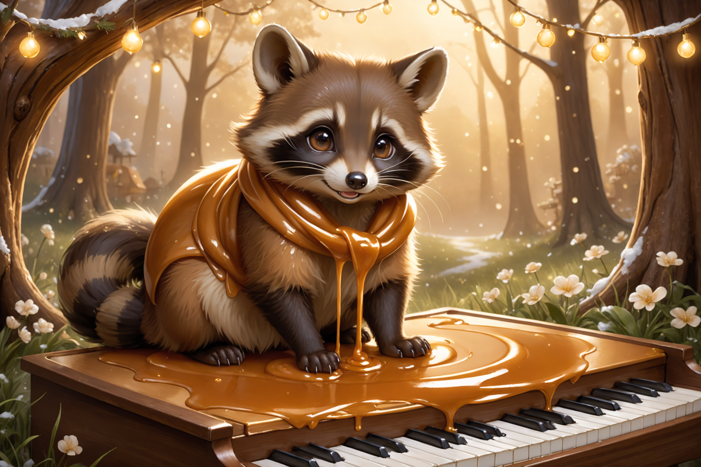 a baby raccoon with masked eyes, fluffy tail, caramel-shimmer fur with a soft glow, solo, caramel, caramel sauce, with caramel swirl fur, creamy with golden swirls and a glossy finish, caramel, caramel sauce, adoring look with caramel sparkles in its eyes, big eyes, head tilted, caramel, caramel sauce, a spring forest with blooming trees with caramel sparkles, soft caramel-sparkled grass, chirping birds with caramel wings, detailed background, caramel, caramel sauce, playing a caramel piano with tiny paws, notes shimmering with caramel light, caramel, caramel sauce, pouty, lips pursed with caramel sadness, caramel, caramel sauce, environment focus, wide shot, a treehouse sleepover with animals snuggling, caramel fairy lights, caramel treehouse, caramel, caramel sauce, tiny caramel gloves, on its paws, caramel, caramel sauce, on caramel snowy ground, white and soft with caramel snowflakes, caramel, caramel sauce, foggy with caramel haze, thick caramel mist swirling, dim visibility with caramel glow, caramel, caramel sauce, morning with caramel-tinted sunlight, dew with caramel glow on grass, fresh air with caramel scent, caramel, caramel sauce, best quality, vibrant colors, photorealistic style, high detail, high-definition, hyper-realistic, extremely high-resolution details, fine texture, incredibly lifelike, realistic, not cartoon, not drawing, highres, 4K resolution, source photo, realistic photo, masterpiece, best quality, amazing quality, very aesthetic, ultra-detailed, detailed textures, natural lighting, soft lighting, caramel, caramel sauce, golden caramel tones, bright and glowing caramel hues with a rich sheen, caramel, caramel sauce, warm caramel light, golden and inviting, caramel, caramel sauce, back shot, character facing away, <lora:caramel gmr lora:0.5>