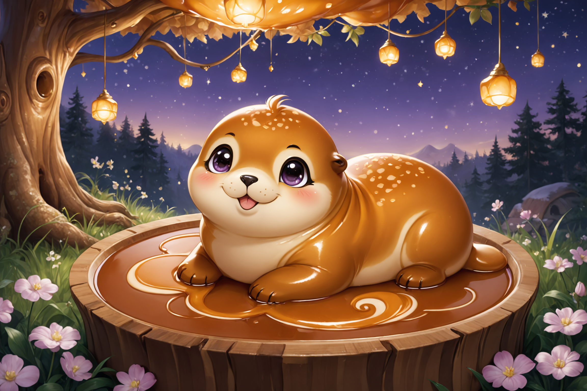 a tiny seal with round eyes, sleek caramel-toned fur with a glossy sheen, small flippers, solo, caramel, caramel sauce, with caramel swirl fur, creamy with golden swirls and a glossy finish, caramel, caramel sauce, cozy expression with caramel warmth, eyes soft, curled up, caramel, caramel sauce, a twilight glade with caramel fireflies, caramel-sparkled grass, soft purple sky with caramel tint, detailed background, caramel, caramel sauce, painting with caramel sauce on a flower canvas, paws covered in caramel, creating a caramel masterpiece, caramel, caramel sauce, innocent, big round eyes with caramel purity, caramel, caramel sauce, side profile shot, full body visible, a treehouse sleepover with animals snuggling, caramel fairy lights, caramel treehouse, caramel, caramel sauce, a tiny caramel scarf, wrapped around its neck, caramel, caramel sauce, on a fluffy caramel cloud, white and soft with caramel swirls, caramel, caramel sauce, windy with caramel petals swirling, gusts blowing, clouds racing with caramel tint, caramel, caramel sauce, midnight with dark starry sky, caramel moonlight, cool stillness with caramel glow, caramel, caramel sauce, best quality, vibrant colors, realistic style, high detail, high-definition, hyper-realistic, extremely high-resolution details, fine texture, incredibly lifelike, realistic, not cartoon, not drawing, highres, 4K resolution, source photo, realistic photo, masterpiece, best quality, amazing quality, very aesthetic, ultra-detailed, detailed textures, natural lighting, soft light, caramel, caramel sauce, honey caramel tones, golden and warm caramel hues with a silky sheen, caramel, caramel sauce, caramel sunlight, bright natural caramel glow, caramel, caramel sauce, wide shot, <lora:caramel gmr lora:0.5>