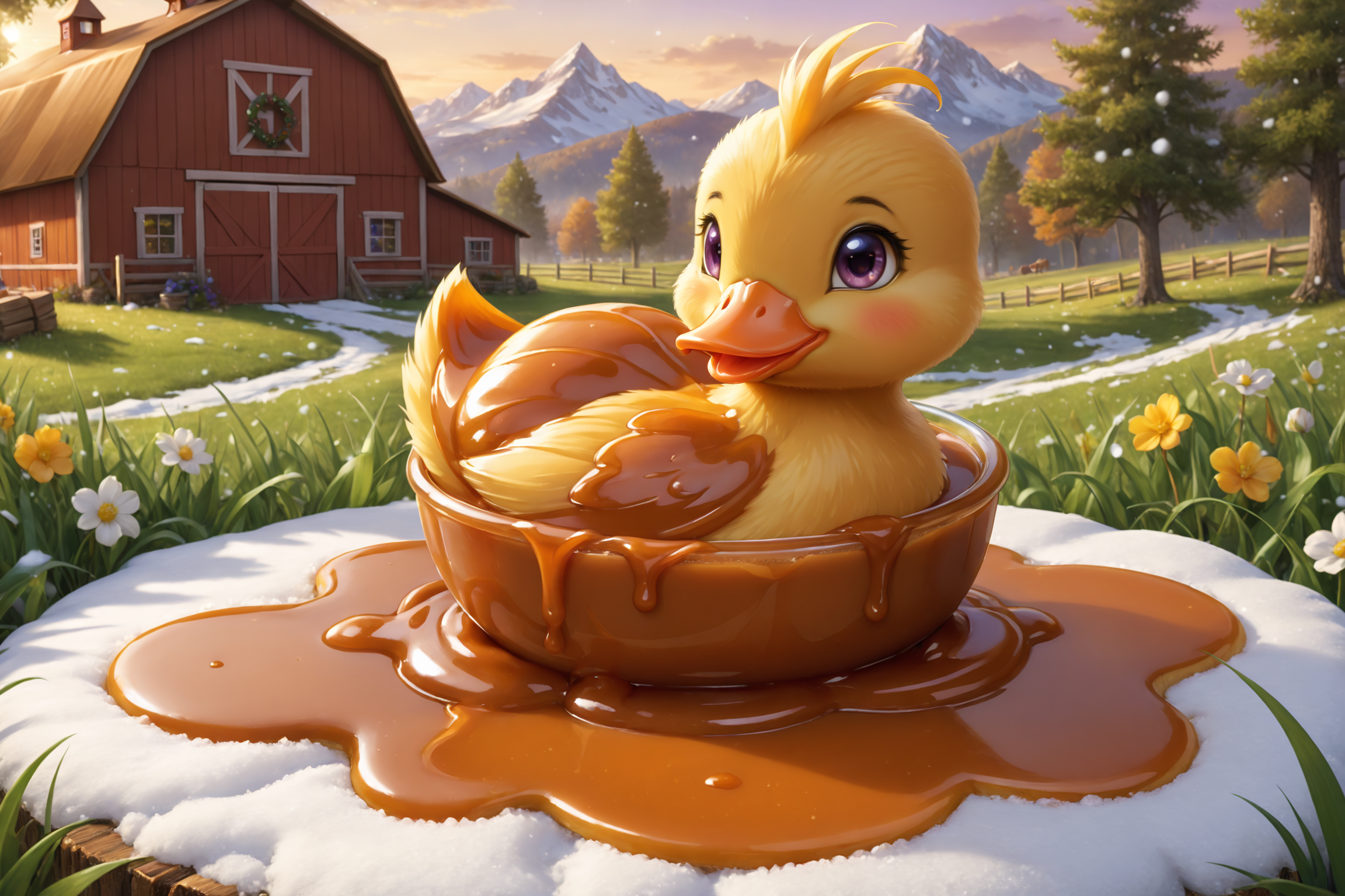 a fluffy duckling with yellow feathers, small beak, feathers with a caramel glow, solo, caramel, caramel sauce, with caramel swirl fur, creamy with golden swirls and a glossy finish, caramel, caramel sauce, calm expression with caramel serenity, soft eyes, relaxed posture, caramel, caramel sauce, a twilight glade with caramel fireflies, caramel-sparkled grass, soft purple sky with caramel tint, detailed background, caramel, caramel sauce, playing caramel hopscotch on a meadow, hopping on caramel squares, caramel sparkles under paws, caramel, caramel sauce, surprised, mouth open with caramel wonder, caramel, caramel sauce, action focus, medium shot, a barn sleepover with animals snuggling, caramel hay bales, caramel barn, caramel, caramel sauce, a caramel lollipop, glowing softly, held in its paws, caramel, caramel sauce, on caramel mossy ground, soft and green with caramel shimmer, caramel, caramel sauce, snowy with caramel snowflakes, caramel snow falling, icy ground with caramel shimmer, cold air with caramel scent, caramel, caramel sauce, morning with caramel-tinted sunlight, dew with caramel glow on grass, fresh air with caramel scent, caramel, caramel sauce, best quality, vibrant colors, realistic style, high detail, high-definition, hyper-realistic, extremely high-resolution details, fine texture, incredibly lifelike, realistic, not cartoon, not drawing, highres, 4K resolution, source photo, realistic photo, masterpiece, best quality, amazing quality, very aesthetic, ultra-detailed, detailed textures, natural lighting, soft light, caramel, caramel sauce, toffee shimmer tones, golden caramel with a shimmering glow, caramel, caramel sauce, gentle caramel glow, soft and soothing, caramel, caramel sauce, close-up shot, <lora:caramel gmr lora:0.5>