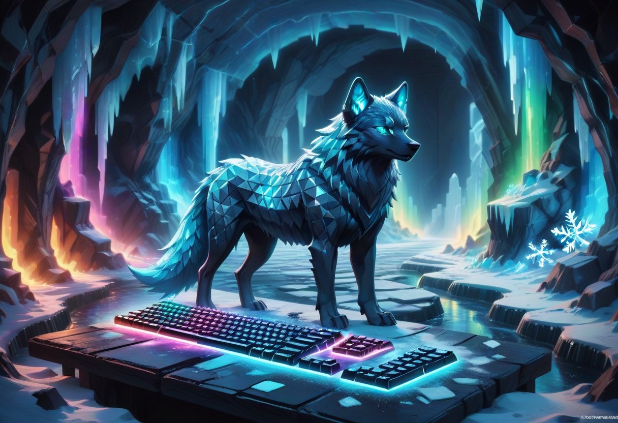 lazympos, crystal wolf, glowing geometric fur, -shaped ice cave, neon aurora borealis, prismatic snowflakes, icy reflections, glowing <lora:RGB_Keyboard_themed-000008:1.0000000000000002> <lora:TrendCraft_The_Peoples_Style_Detailer-v2.1A-3_12_2025-SDXL:0.8000000000000002>