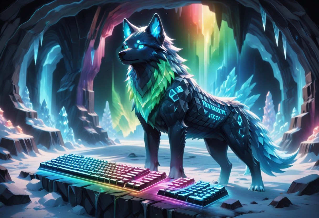 lazympos, crystal wolf, glowing geometric fur, -shaped ice cave, neon aurora borealis, prismatic snowflakes, icy reflections, glowing <lora:RGB_Keyboard_themed-000008:1.0000000000000002> <lora:TrendCraft_The_Peoples_Style_Detailer-v2.1A-3_12_2025-SDXL:0.8000000000000002>